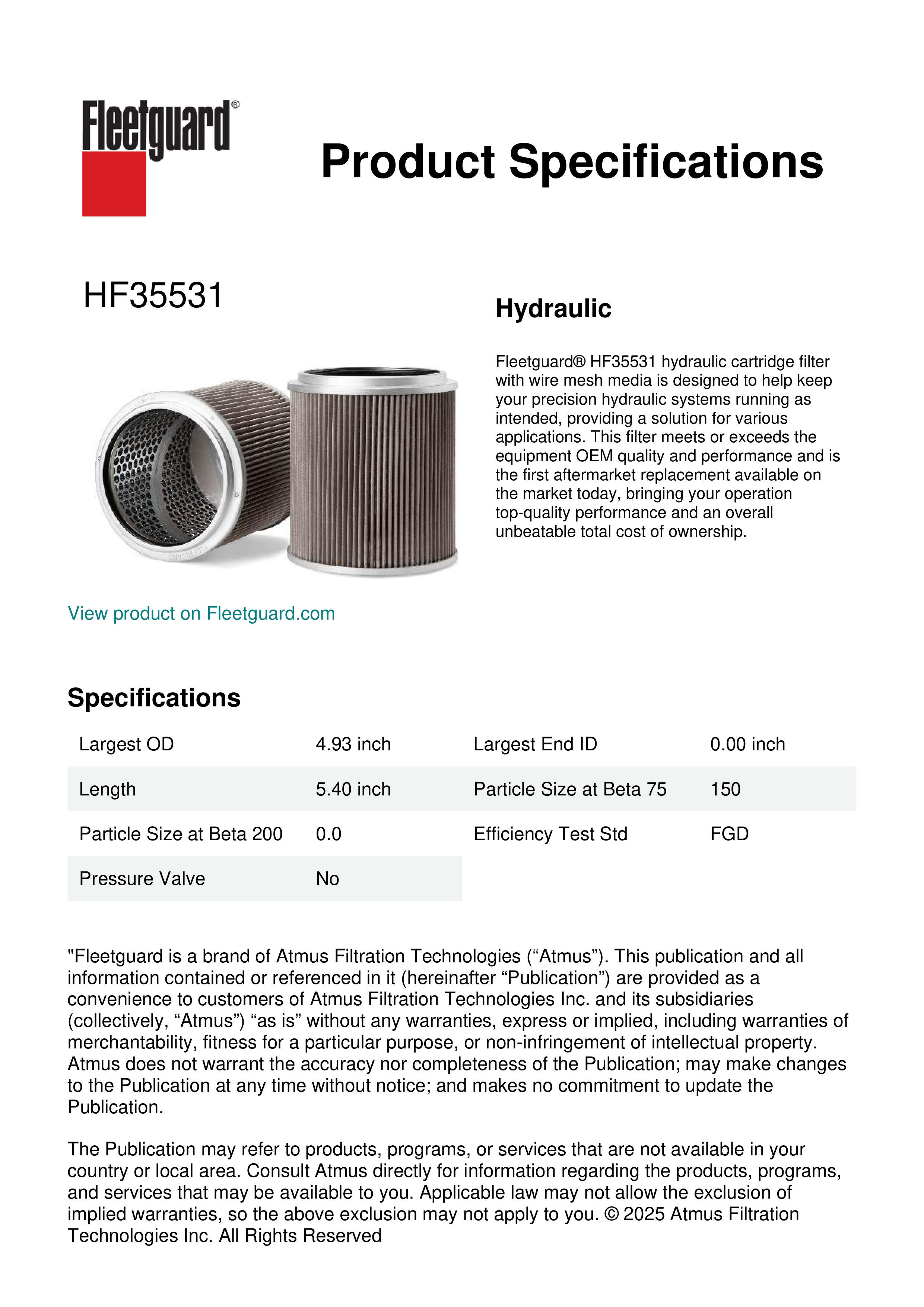 Fleetguard® HF35531 hydraulic cartridge filter with wire mesh media is designed to help keep your precision hydraulic systems running as intended, providing a solution for various applications. This filter meets or exceeds the equipment OEM quality and performance and is the first aftermarket replacement available on the market today, bringing your operation top-quality performance and an overall unbeatable total cost of ownership.Specification