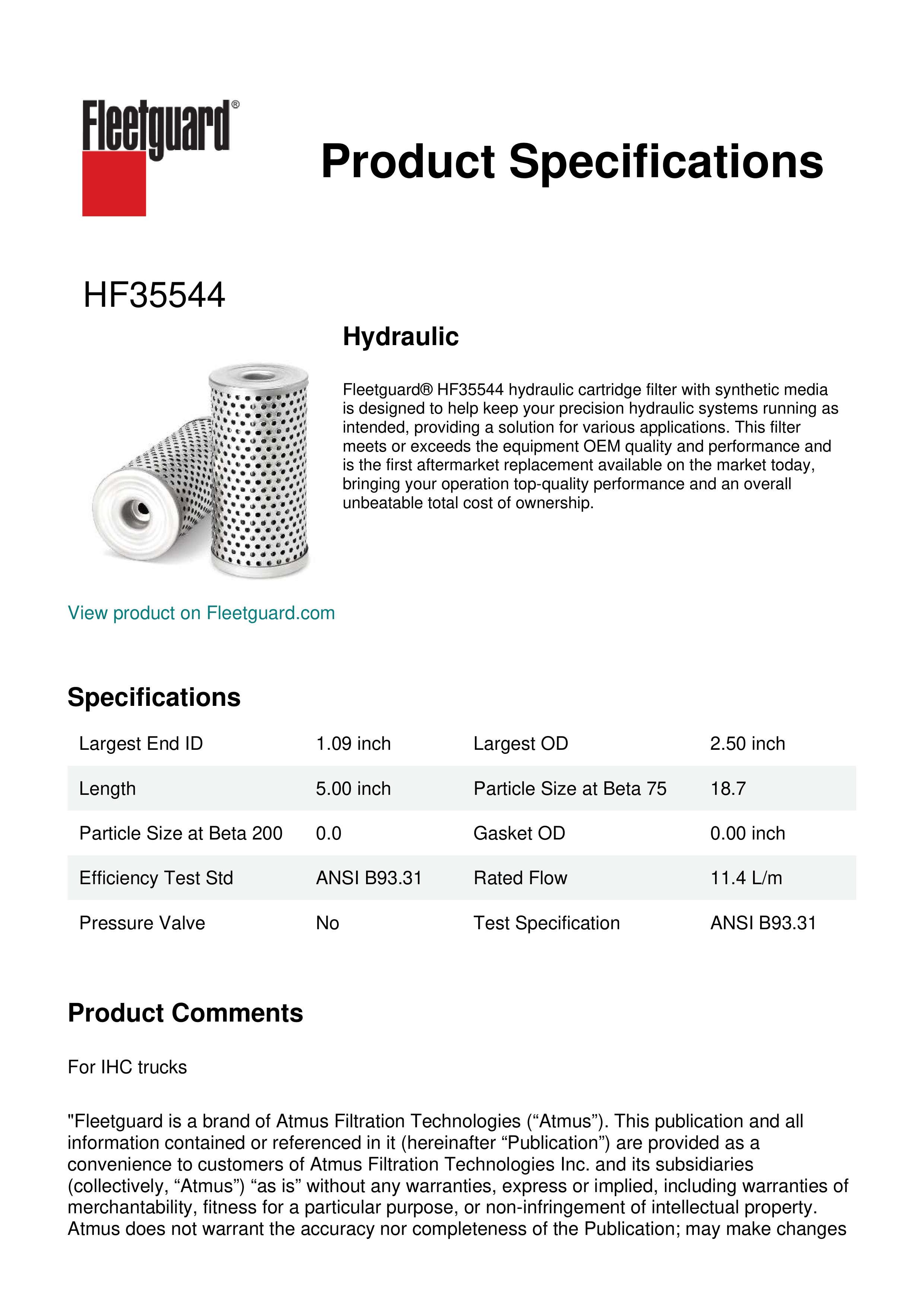 Fleetguard® HF35544 hydraulic cartridge filter with synthetic media is designed to help keep your precision hydraulic systems running as intended, providing a solution for various applications. This filter meets or exceeds the equipment OEM quality and performance and is the first aftermarket replacement available on the market today, bringing your operation top-quality performance and an overall unbeatable total cost of ownership.Specification