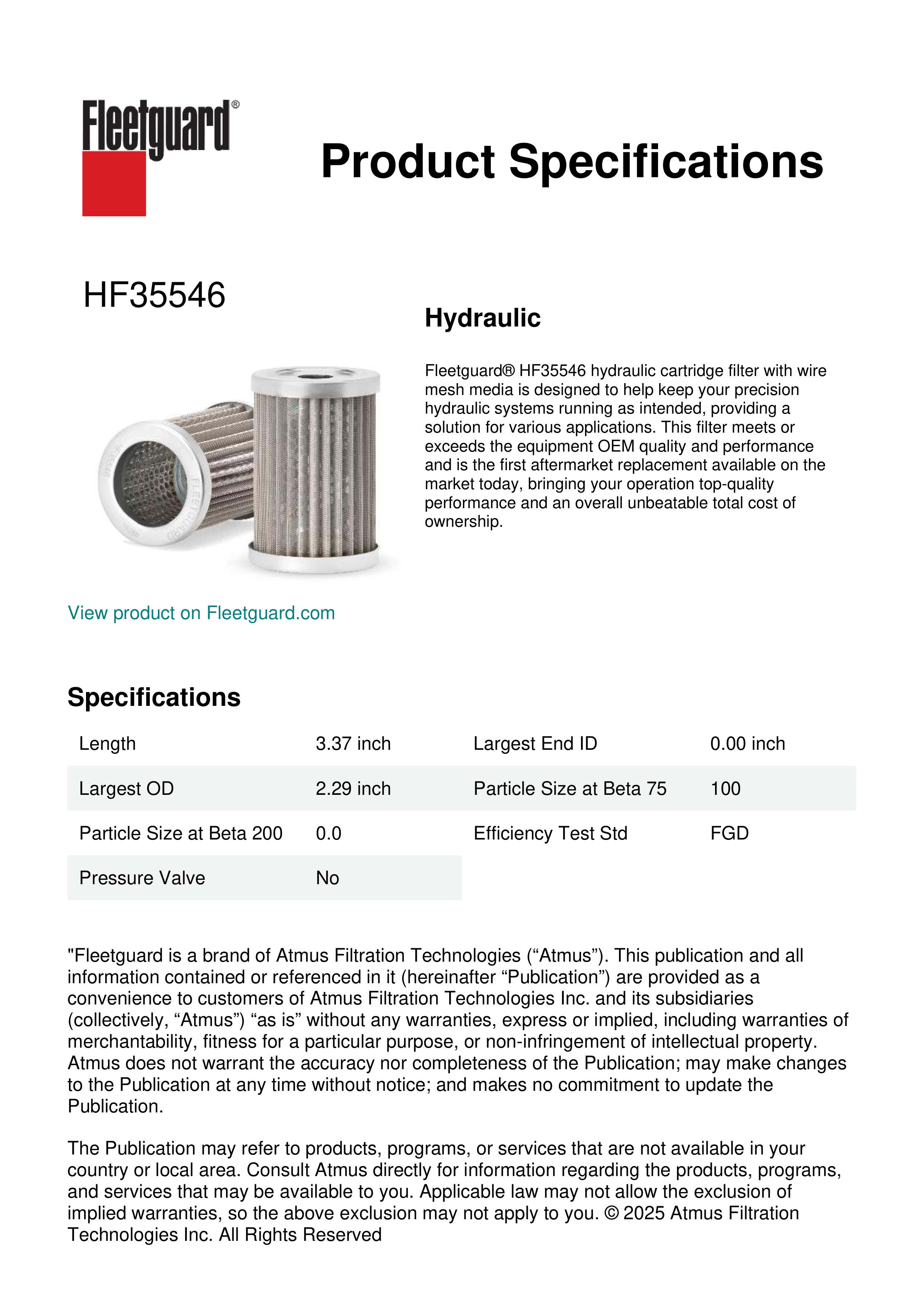 Fleetguard® HF35546 hydraulic cartridge filter with wire mesh media is designed to help keep your precision hydraulic systems running as intended, providing a solution for various applications. This filter meets or exceeds the equipment OEM quality and performance and is the first aftermarket replacement available on the market today, bringing your operation top-quality performance and an overall unbeatable total cost of ownership.Specification