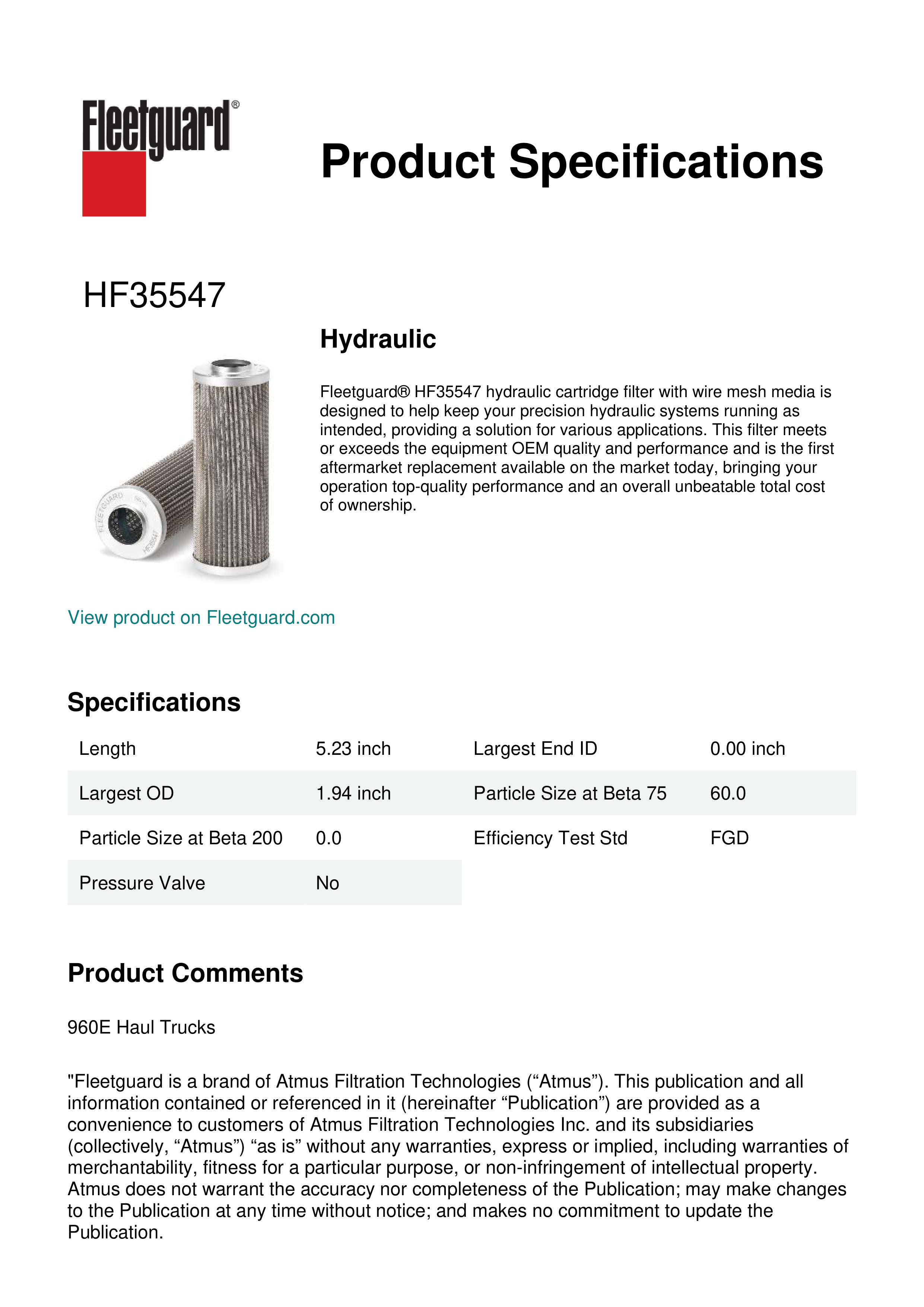 Fleetguard® HF35547 hydraulic cartridge filter with wire mesh media is designed to help keep your precision hydraulic systems running as intended, providing a solution for various applications. This filter meets or exceeds the equipment OEM quality and performance and is the first aftermarket replacement available on the market today, bringing your operation top-quality performance and an overall unbeatable total cost of ownership.Specification