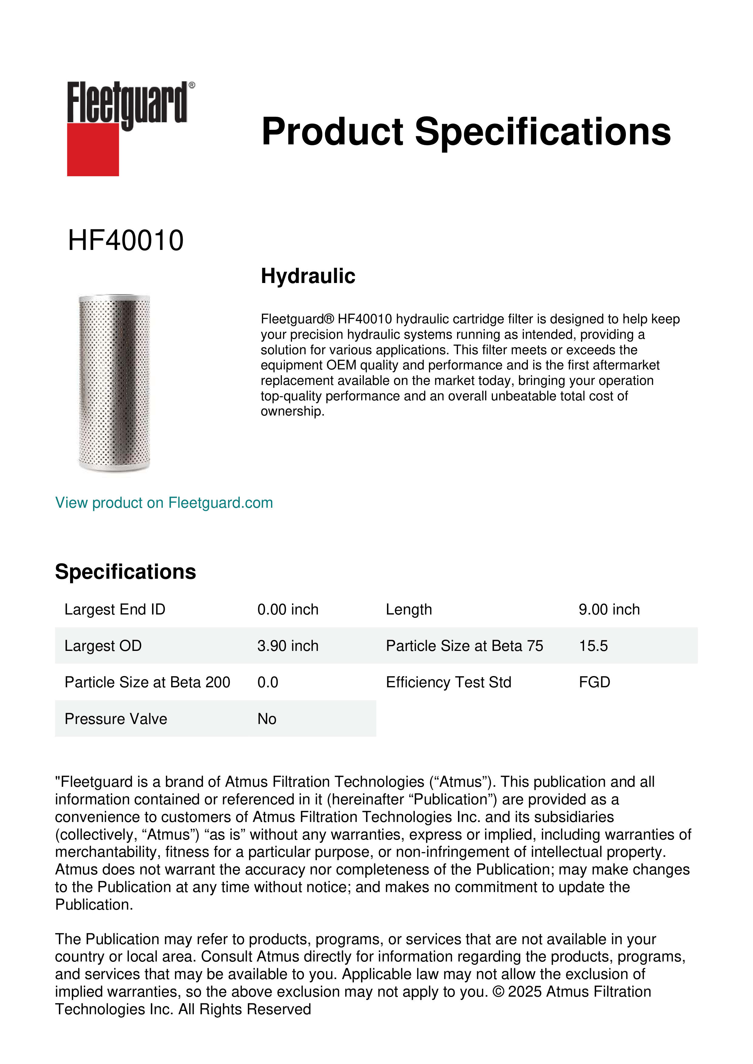 Fleetguard® HF40010 hydraulic cartridge filter is designed to help keep your precision hydraulic systems running as intended, providing a solution for various applications. This filter meets or exceeds the equipment OEM quality and performance and is the first aftermarket replacement available on the market today, bringing your operation top-quality performance and an overall unbeatable total cost of ownership.Specification