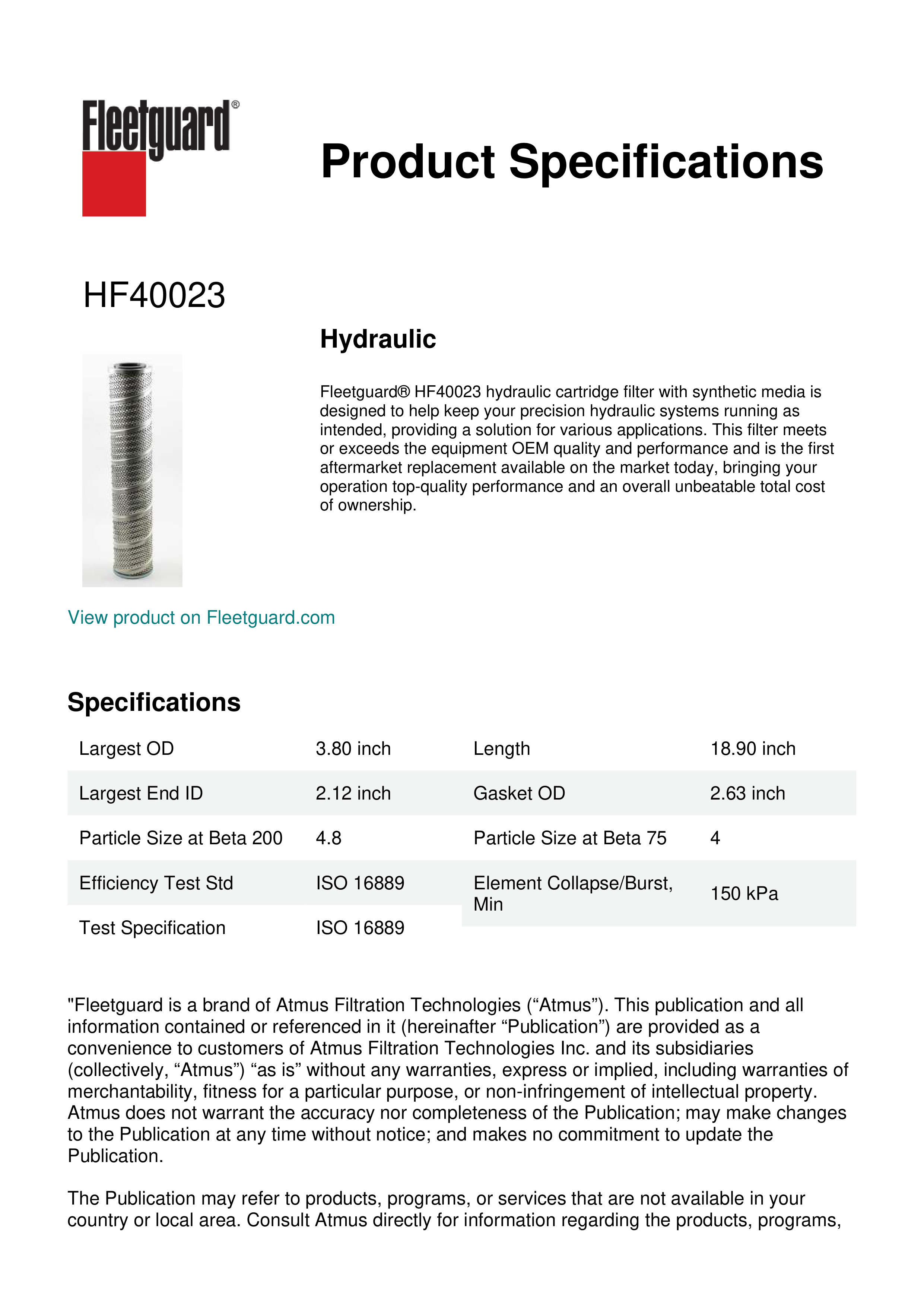 Fleetguard® HF40023 hydraulic cartridge filter with synthetic media is designed to help keep your precision hydraulic systems running as intended, providing a solution for various applications. This filter meets or exceeds the equipment OEM quality and performance and is the first aftermarket replacement available on the market today, bringing your operation top-quality performance and an overall unbeatable total cost of ownership.Specification