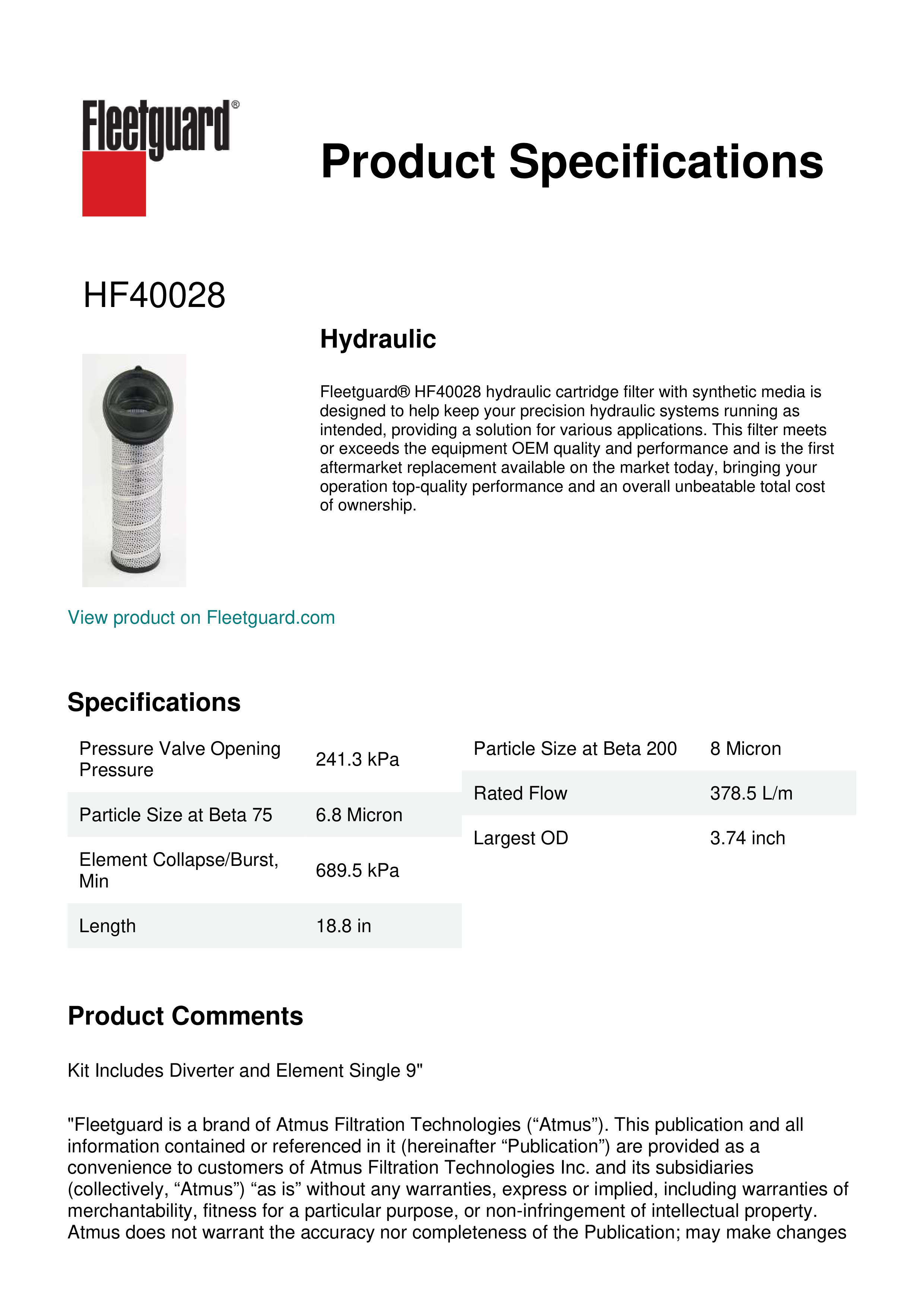 Fleetguard® HF40028 hydraulic cartridge filter with synthetic media is designed to help keep your precision hydraulic systems running as intended, providing a solution for various applications. This filter meets or exceeds the equipment OEM quality and performance and is the first aftermarket replacement available on the market today, bringing your operation top-quality performance and an overall unbeatable total cost of ownership.Specification