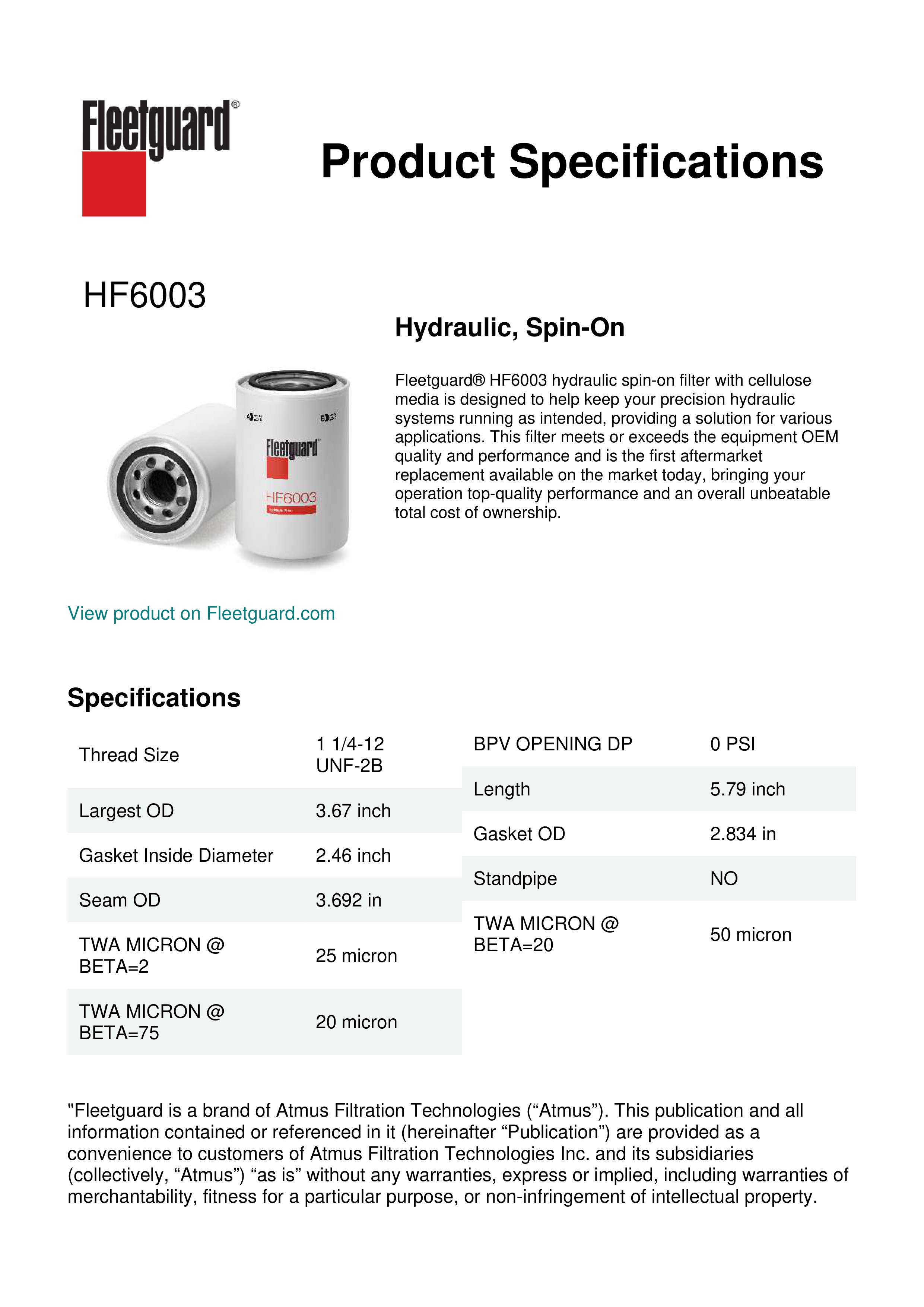 Fleetguard® HF6003 hydraulic spin-on filter with cellulose media is designed to help keep your precision hydraulic systems running as intended, providing a solution for various applications. This filter meets or exceeds the equipment OEM quality and performance and is the first aftermarket replacement available on the market today, bringing your operation top-quality performance and an overall unbeatable total cost of ownership.Specification