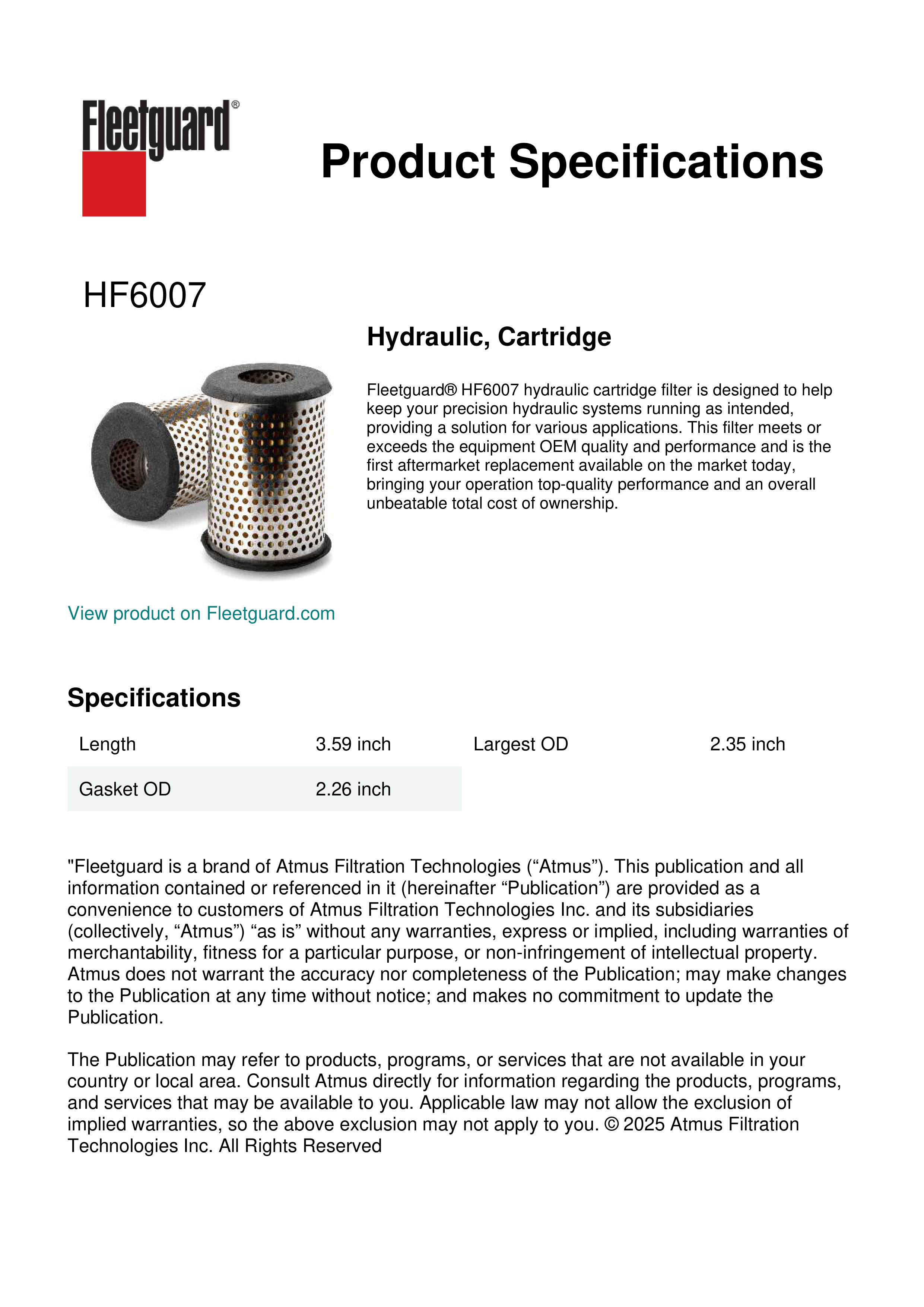Fleetguard® HF6007 hydraulic cartridge filter is designed to help keep your precision hydraulic systems running as intended, providing a solution for various applications. This filter meets or exceeds the equipment OEM quality and performance and is the first aftermarket replacement available on the market today, bringing your operation top-quality performance and an overall unbeatable total cost of ownership.Specification