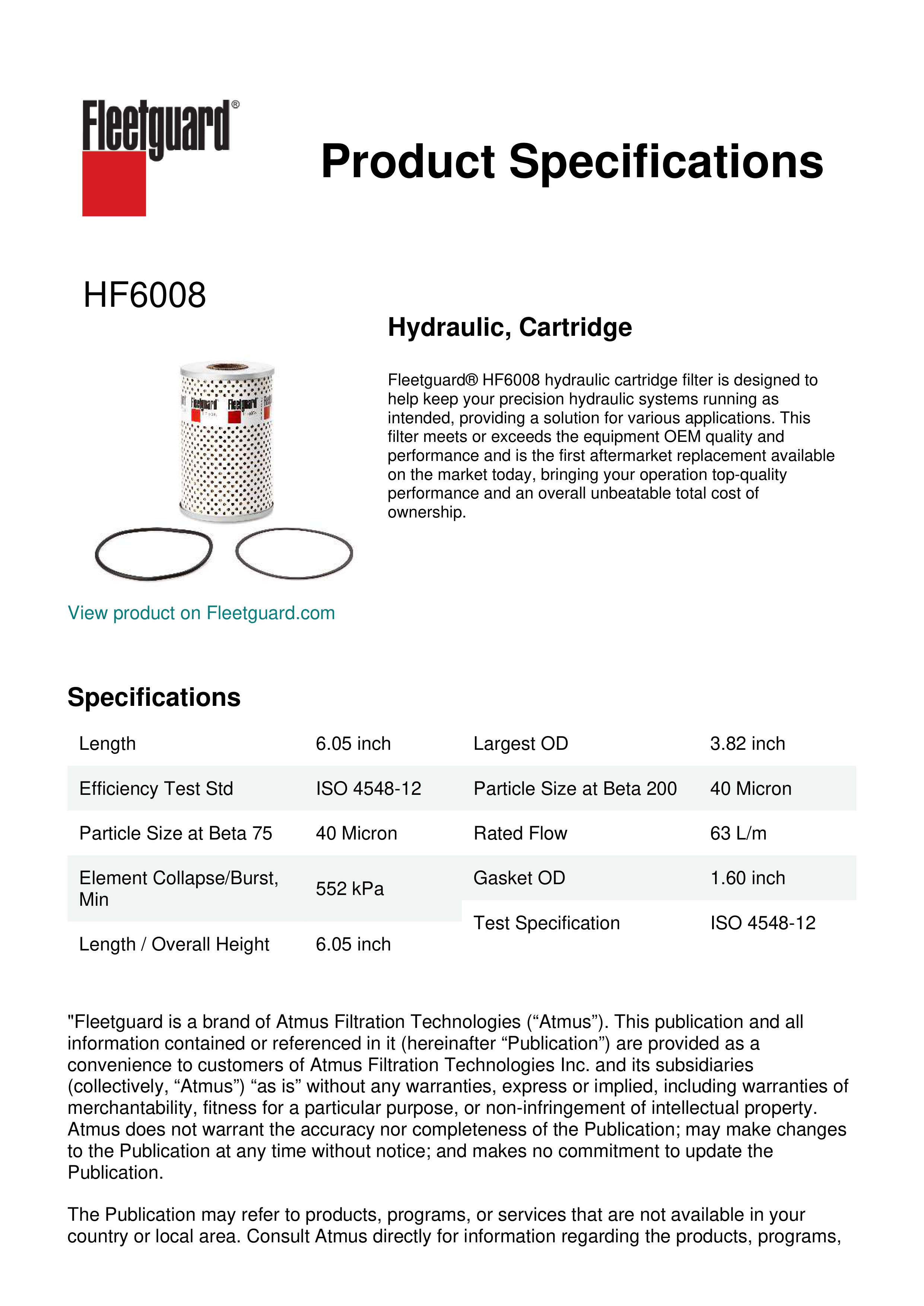 Fleetguard® HF6008 hydraulic cartridge filter is designed to help keep your precision hydraulic systems running as intended, providing a solution for various applications. This filter meets or exceeds the equipment OEM quality and performance and is the first aftermarket replacement available on the market today, bringing your operation top-quality performance and an overall unbeatable total cost of ownership.Specification