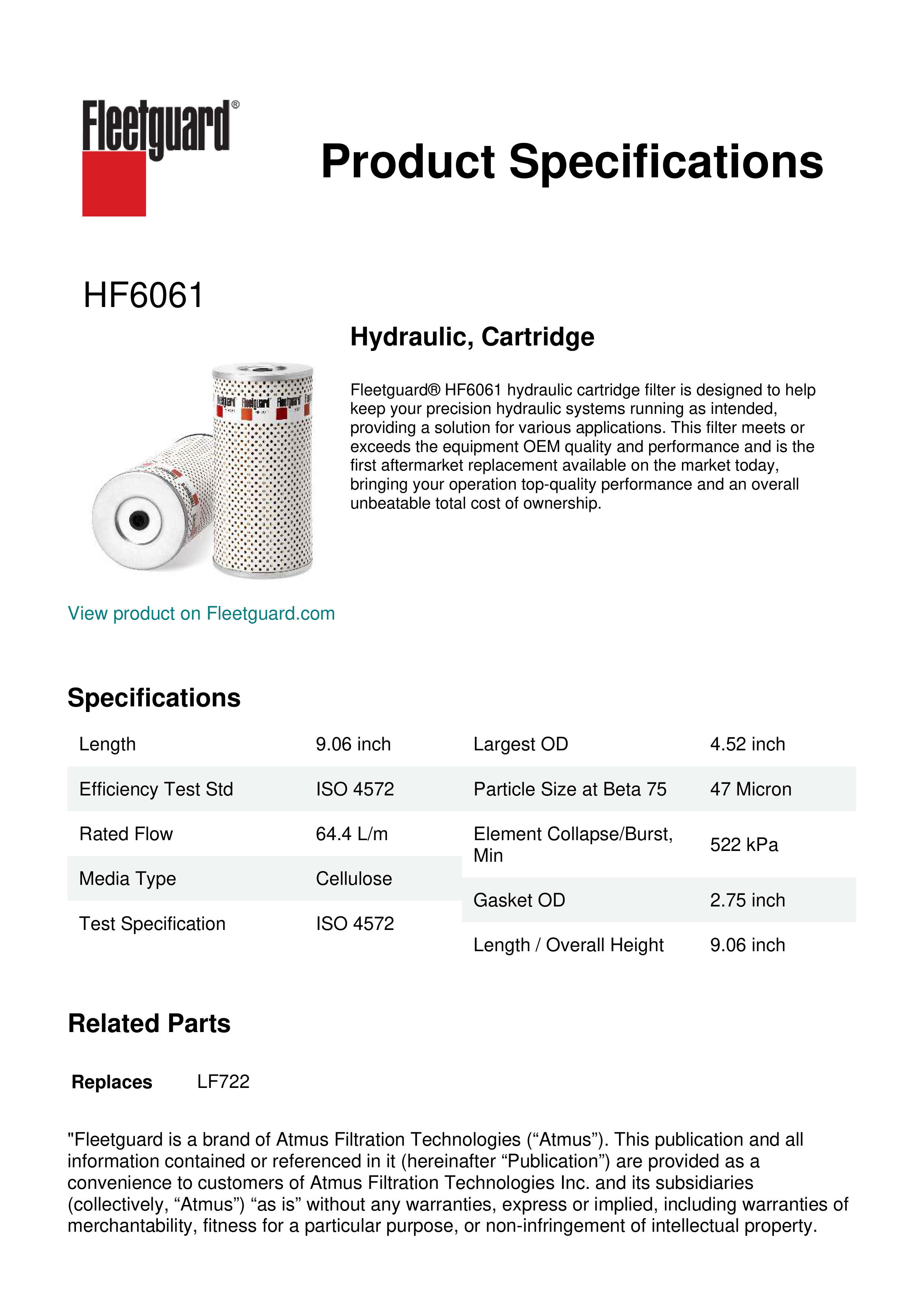 Fleetguard® HF6061 hydraulic cartridge filter is designed to help keep your precision hydraulic systems running as intended, providing a solution for various applications. This filter meets or exceeds the equipment OEM quality and performance and is the first aftermarket replacement available on the market today, bringing your operation top-quality performance and an overall unbeatable total cost of ownership.Specification