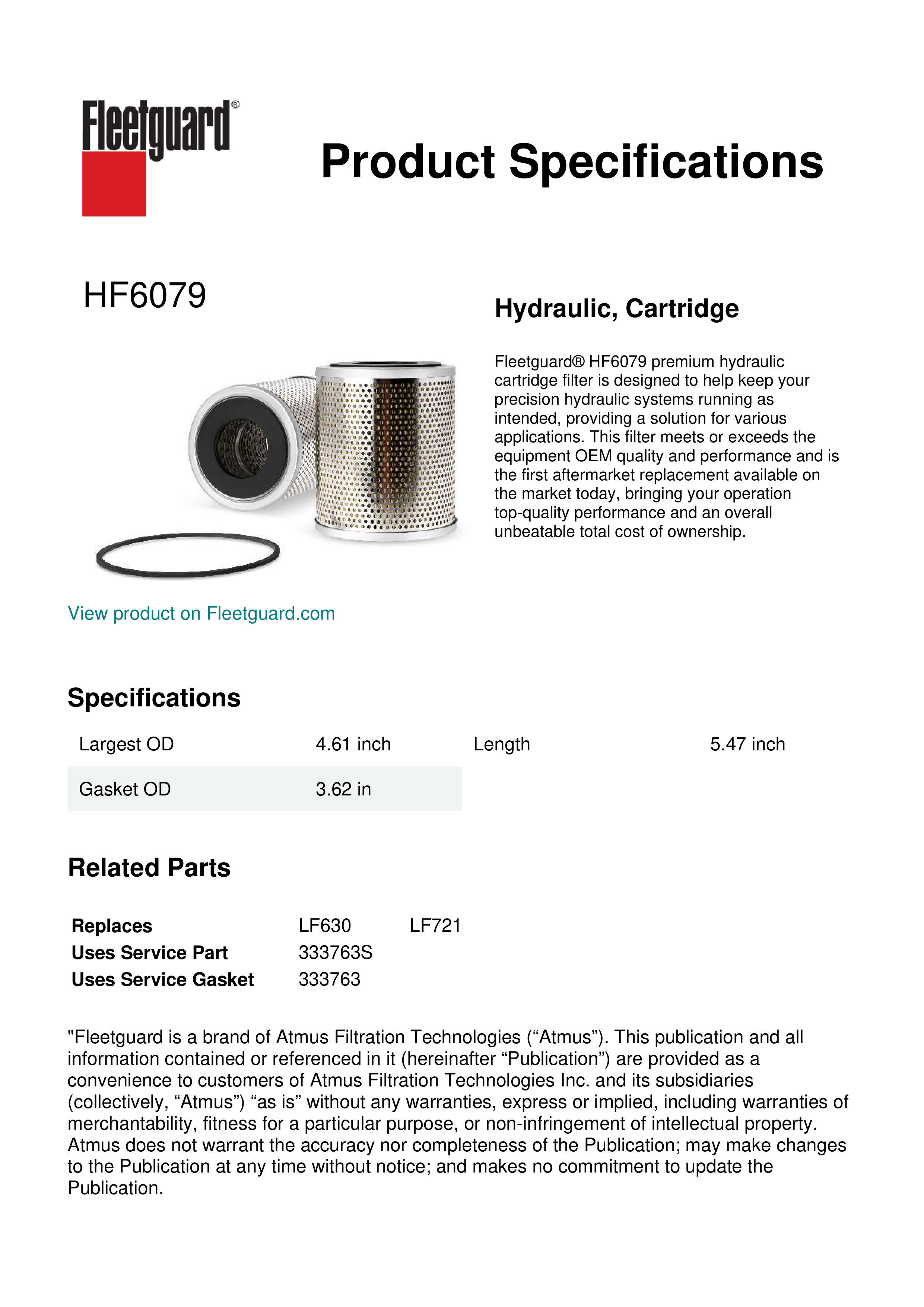 Fleetguard® HF6079 premium hydraulic cartridge filter is designed to help keep your precision hydraulic systems running as intended, providing a solution for various applications. This filter meets or exceeds the equipment OEM quality and performance and is the first aftermarket replacement available on the market today, bringing your operation top-quality performance and an overall unbeatable total cost of ownership.Specification