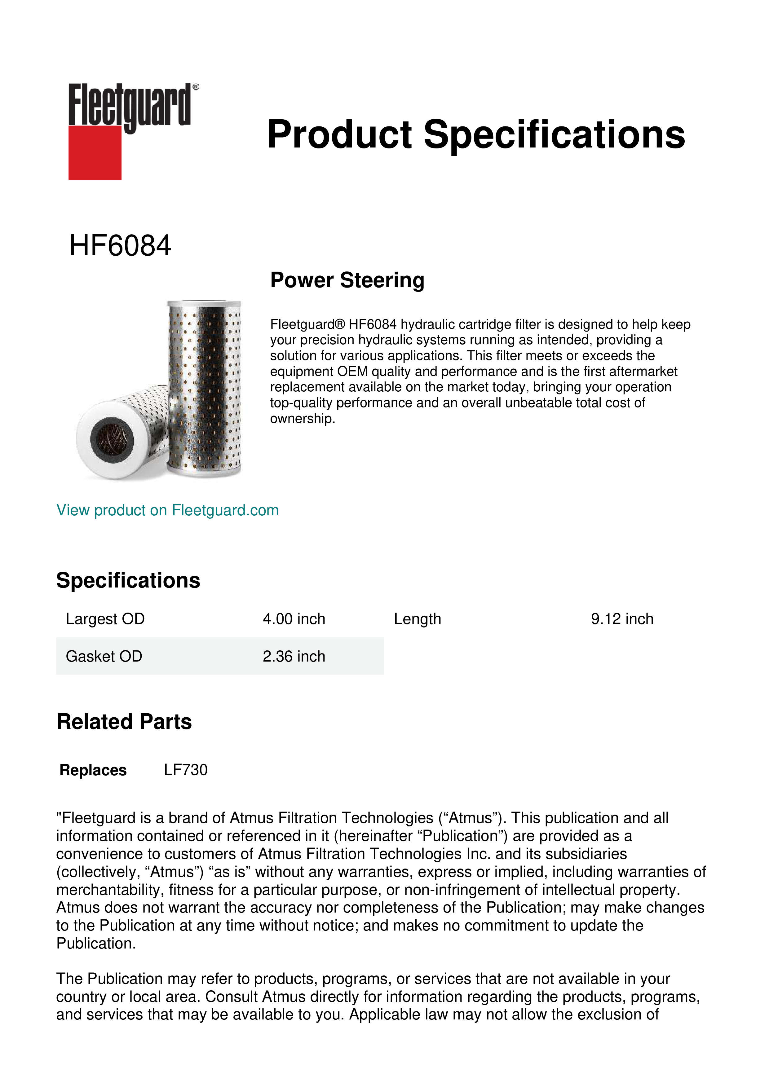Fleetguard® HF6084 hydraulic cartridge filter is designed to help keep your precision hydraulic systems running as intended, providing a solution for various applications. This filter meets or exceeds the equipment OEM quality and performance and is the first aftermarket replacement available on the market today, bringing your operation top-quality performance and an overall unbeatable total cost of ownership.Specification