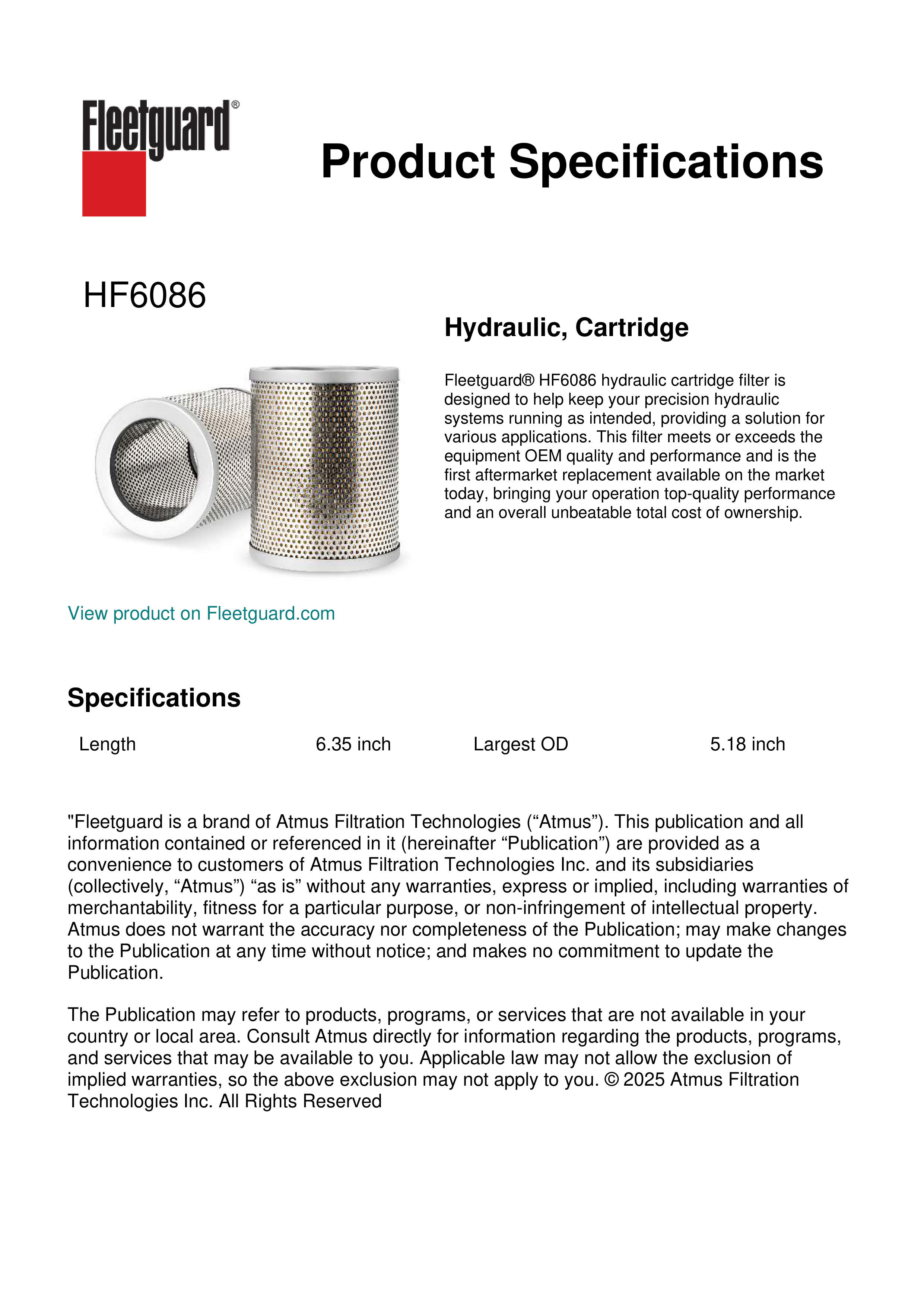 Fleetguard® HF6086 hydraulic cartridge filter is designed to help keep your precision hydraulic systems running as intended, providing a solution for various applications. This filter meets or exceeds the equipment OEM quality and performance and is the first aftermarket replacement available on the market today, bringing your operation top-quality performance and an overall unbeatable total cost of ownership.Specification