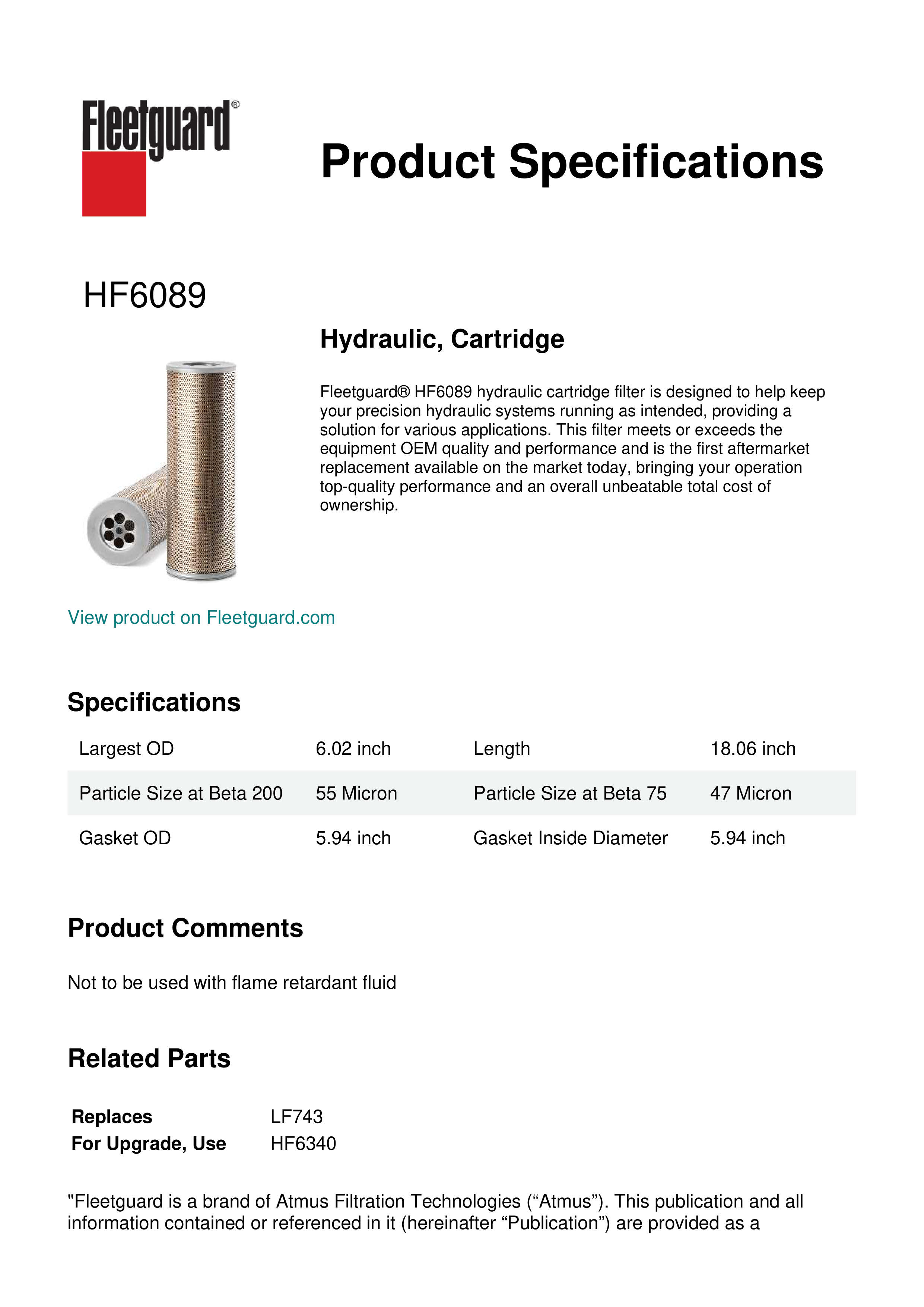Fleetguard® HF6089 hydraulic cartridge filter is designed to help keep your precision hydraulic systems running as intended, providing a solution for various applications. This filter meets or exceeds the equipment OEM quality and performance and is the first aftermarket replacement available on the market today, bringing your operation top-quality performance and an overall unbeatable total cost of ownership.Specification
