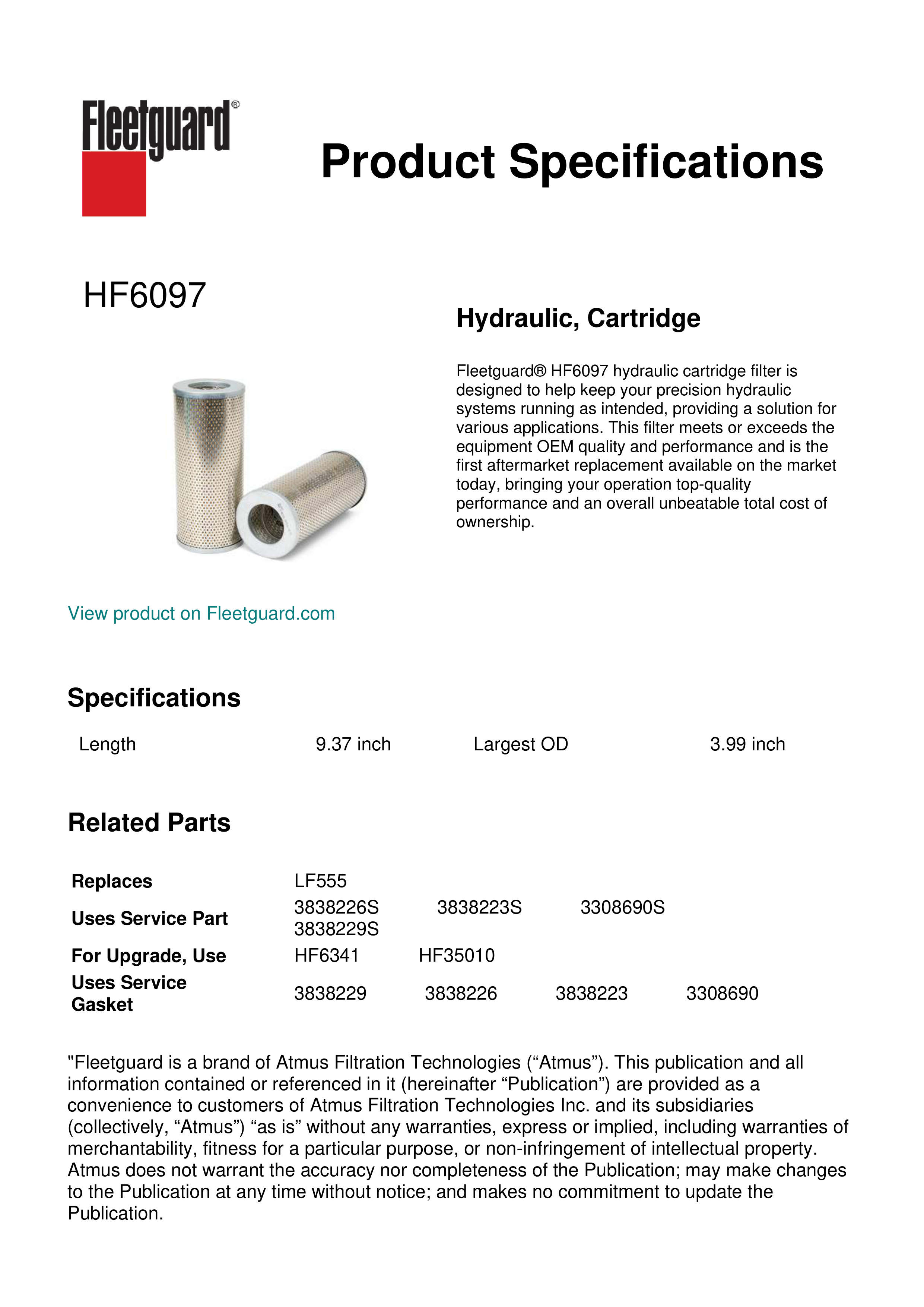 Fleetguard® HF6097 hydraulic cartridge filter is designed to help keep your precision hydraulic systems running as intended, providing a solution for various applications. This filter meets or exceeds the equipment OEM quality and performance and is the first aftermarket replacement available on the market today, bringing your operation top-quality performance and an overall unbeatable total cost of ownership.Specification