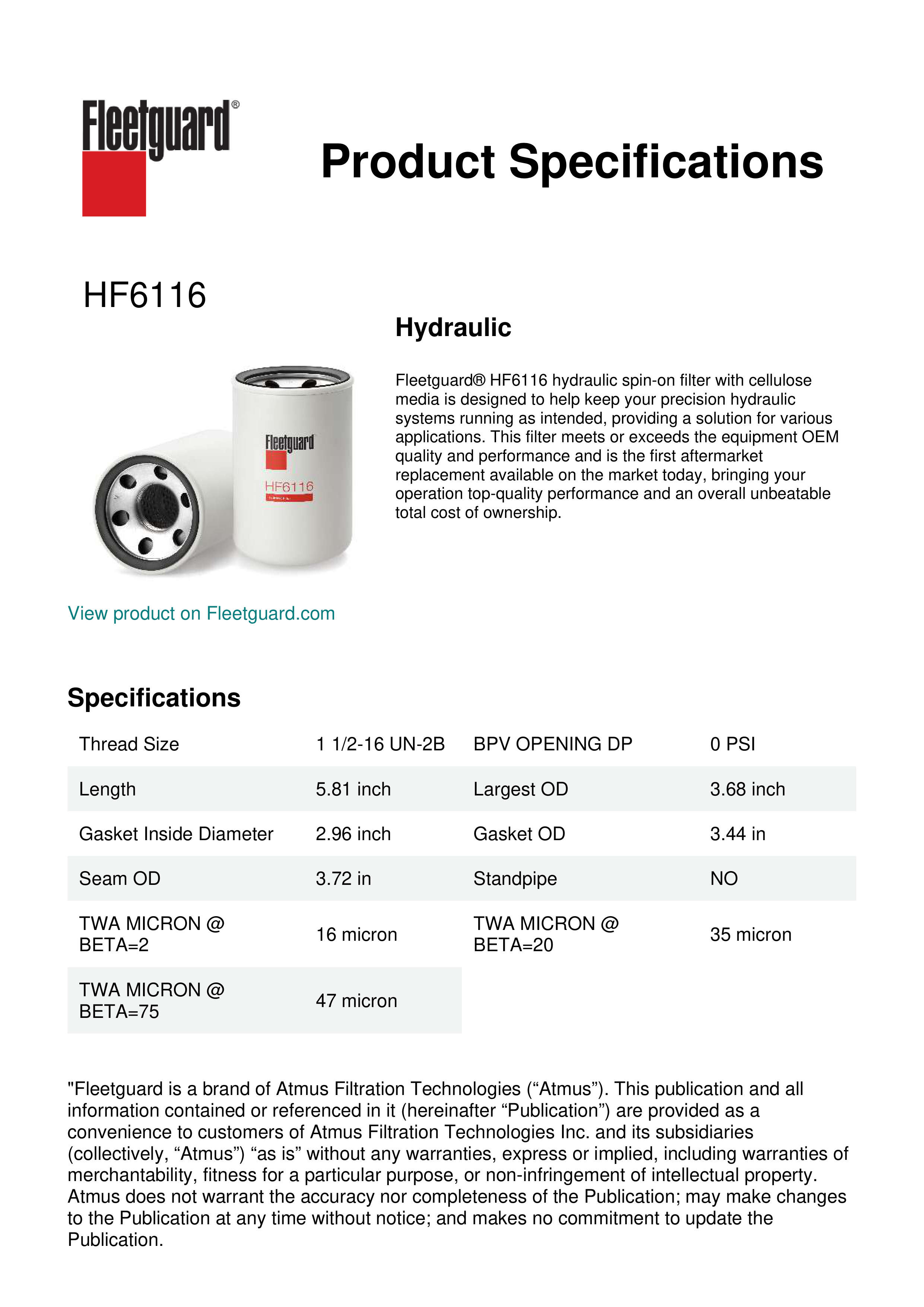 Fleetguard® HF6116 hydraulic spin-on filter with cellulose media is designed to help keep your precision hydraulic systems running as intended, providing a solution for various applications. This filter meets or exceeds the equipment OEM quality and performance and is the first aftermarket replacement available on the market today, bringing your operation top-quality performance and an overall unbeatable total cost of ownership.Specification