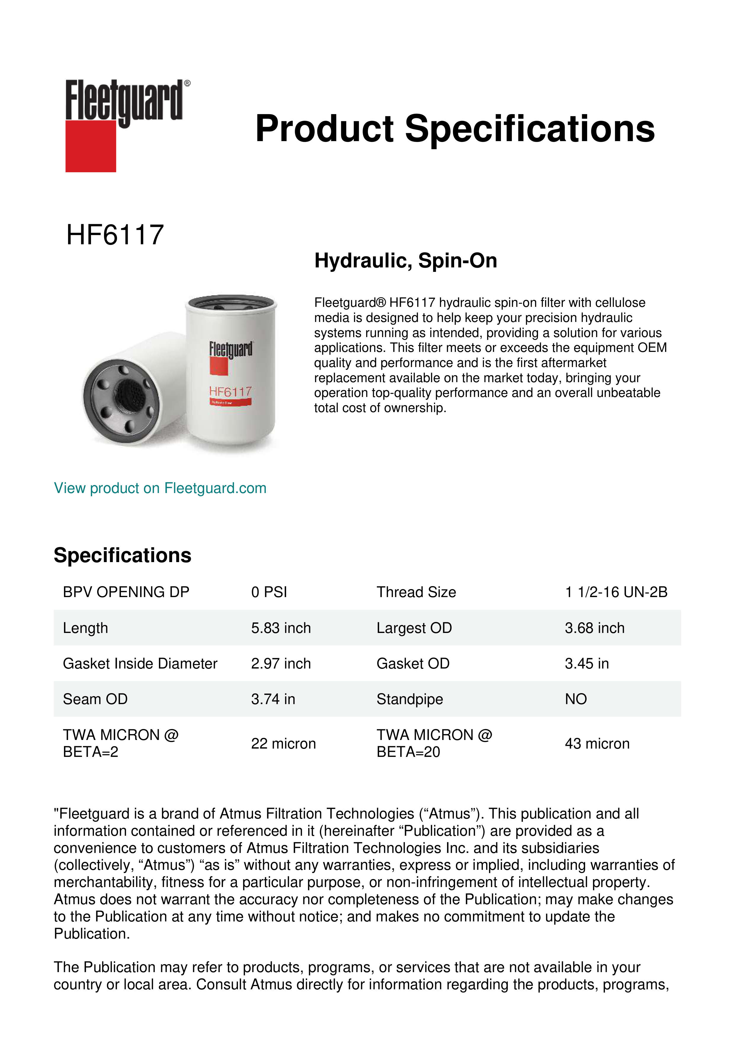 Fleetguard® HF6117 hydraulic spin-on filter with cellulose media is designed to help keep your precision hydraulic systems running as intended, providing a solution for various applications. This filter meets or exceeds the equipment OEM quality and performance and is the first aftermarket replacement available on the market today, bringing your operation top-quality performance and an overall unbeatable total cost of ownership.Specification