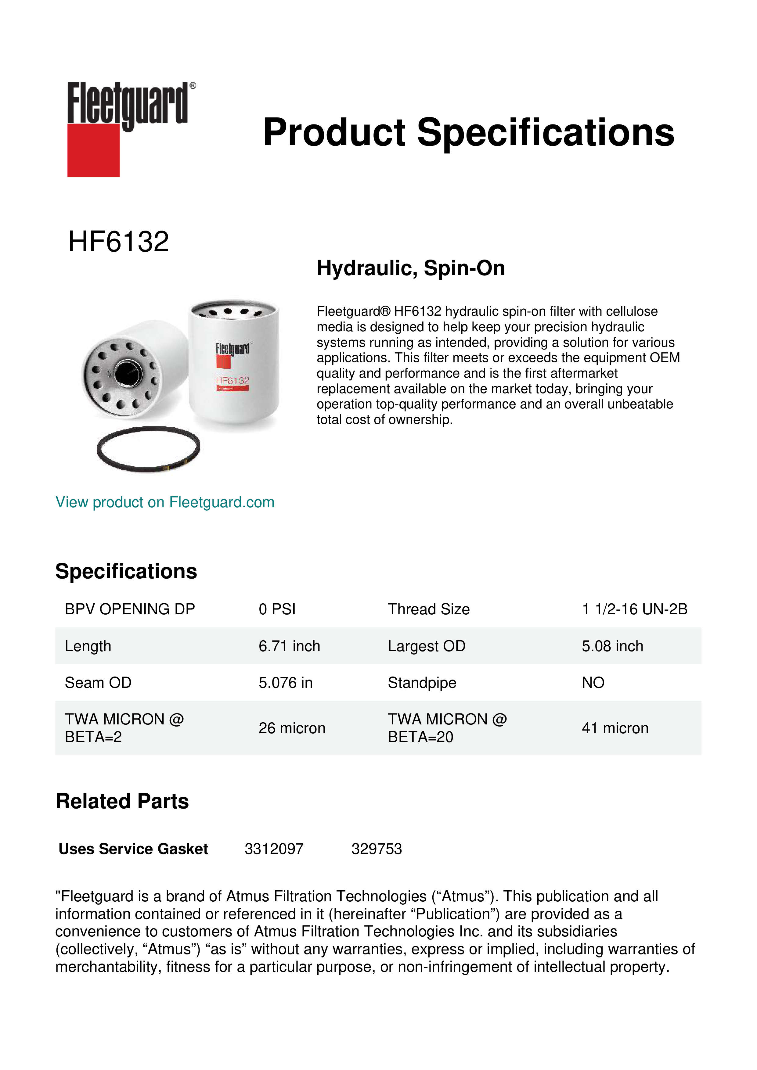 Fleetguard® HF6132 hydraulic spin-on filter with cellulose media is designed to help keep your precision hydraulic systems running as intended, providing a solution for various applications. This filter meets or exceeds the equipment OEM quality and performance and is the first aftermarket replacement available on the market today, bringing your operation top-quality performance and an overall unbeatable total cost of ownership.Specification