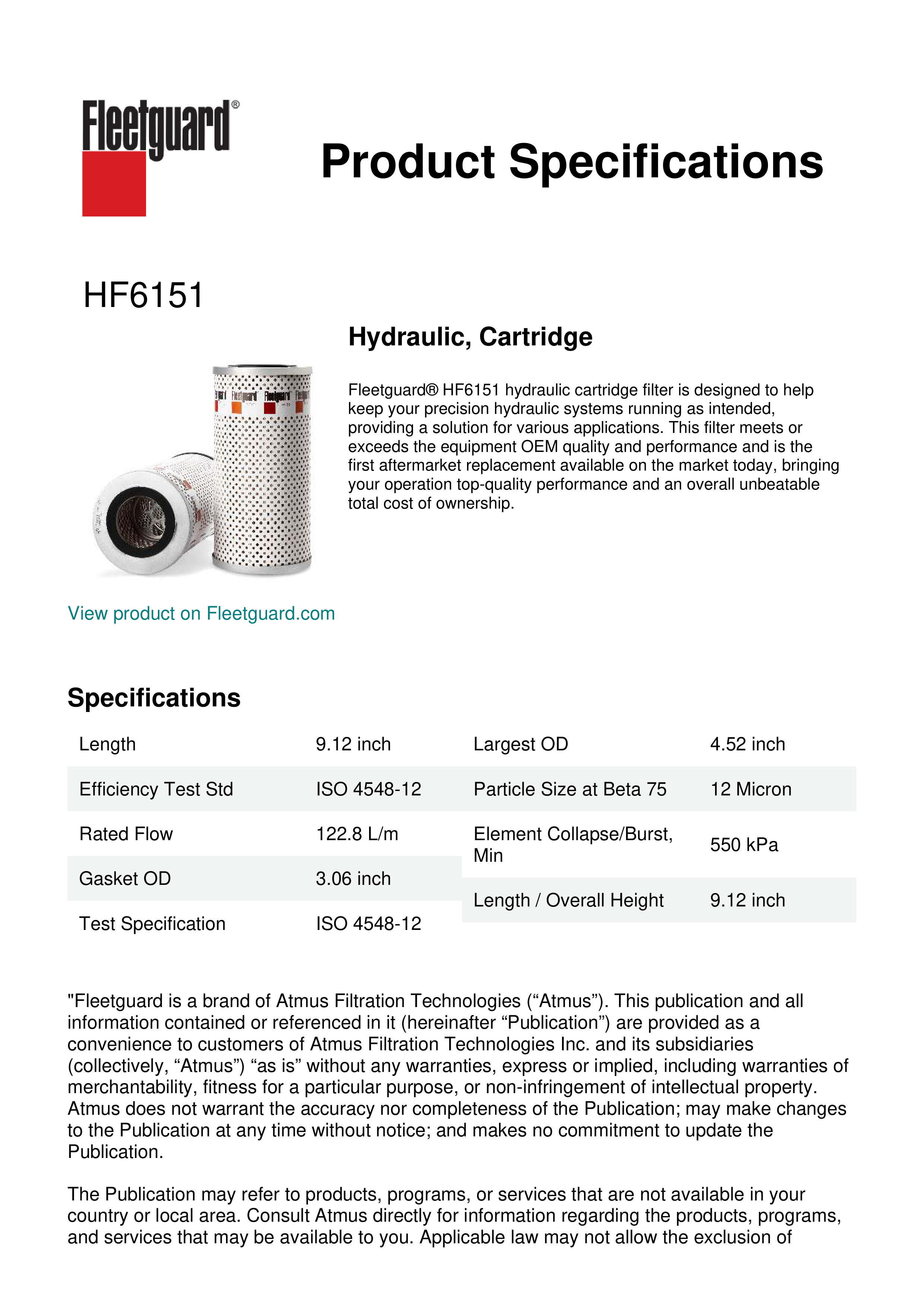 Fleetguard® HF6151 hydraulic cartridge filter is designed to help keep your precision hydraulic systems running as intended, providing a solution for various applications. This filter meets or exceeds the equipment OEM quality and performance and is the first aftermarket replacement available on the market today, bringing your operation top-quality performance and an overall unbeatable total cost of ownership.Specification