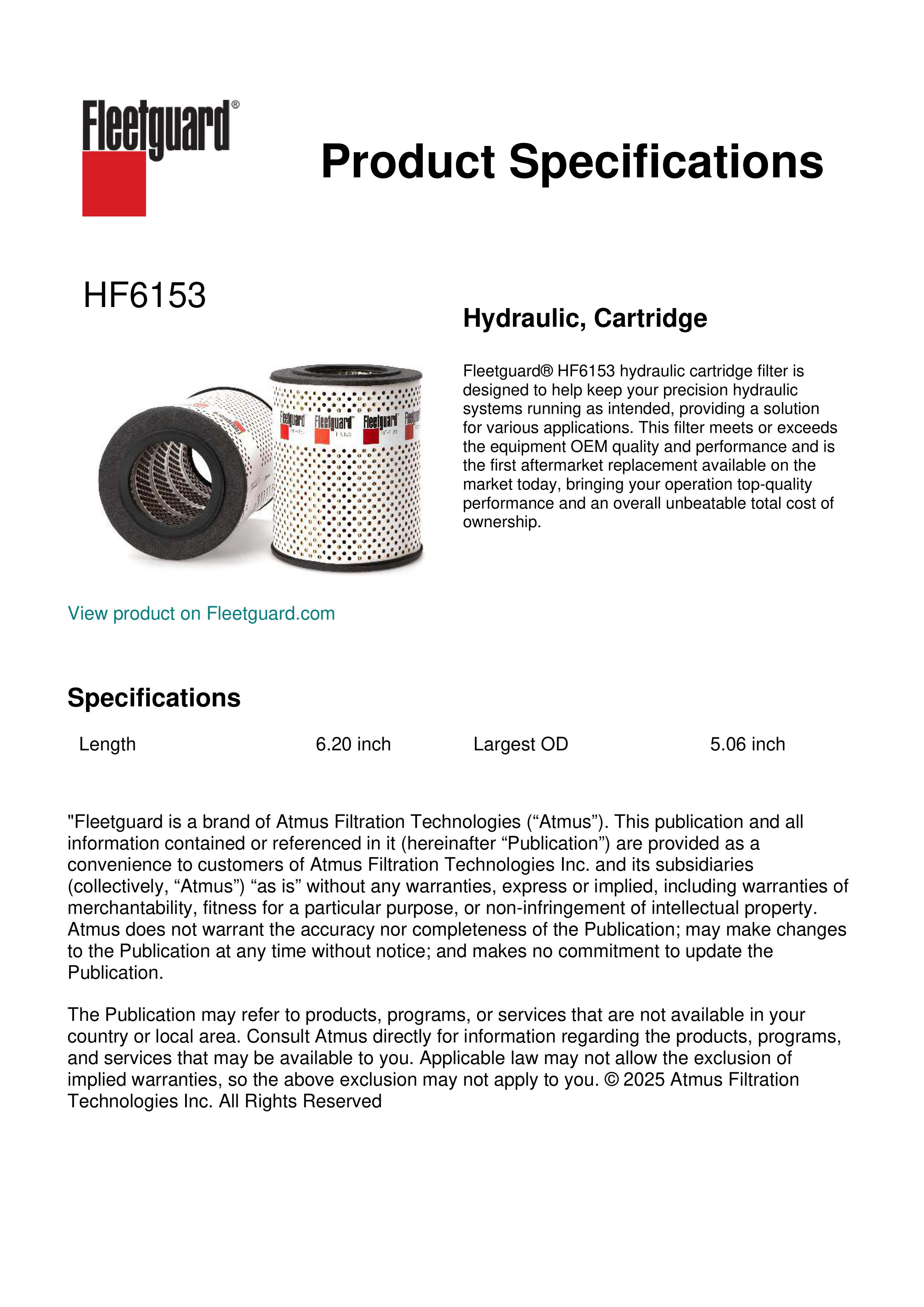 Fleetguard® HF6153 hydraulic cartridge filter is designed to help keep your precision hydraulic systems running as intended, providing a solution for various applications. This filter meets or exceeds the equipment OEM quality and performance and is the first aftermarket replacement available on the market today, bringing your operation top-quality performance and an overall unbeatable total cost of ownership.Specification