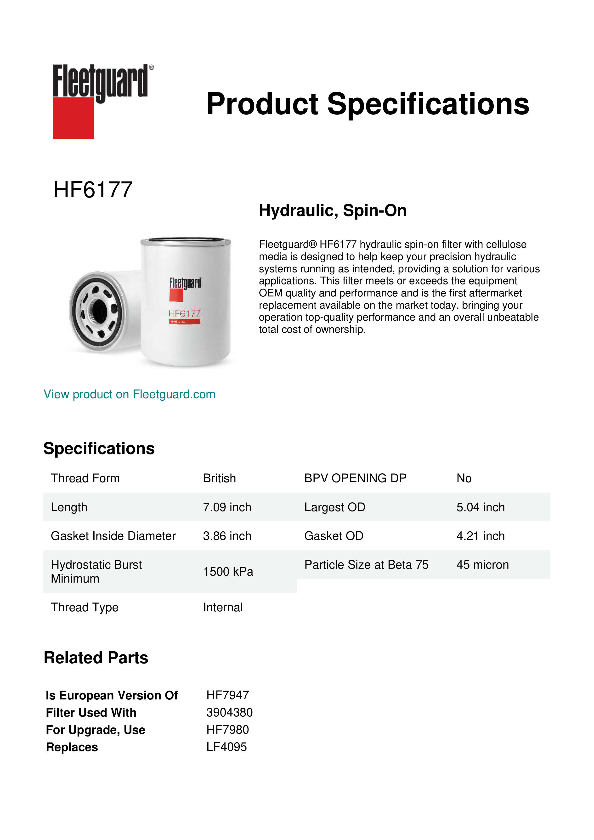Fleetguard® HF6177 hydraulic spin-on filter with cellulose media is designed to help keep your precision hydraulic systems running as intended, providing a solution for various applications. This filter meets or exceeds the equipment OEM quality and performance and is the first aftermarket replacement available on the market today, bringing your operation top-quality performance and an overall unbeatable total cost of ownership.Specification