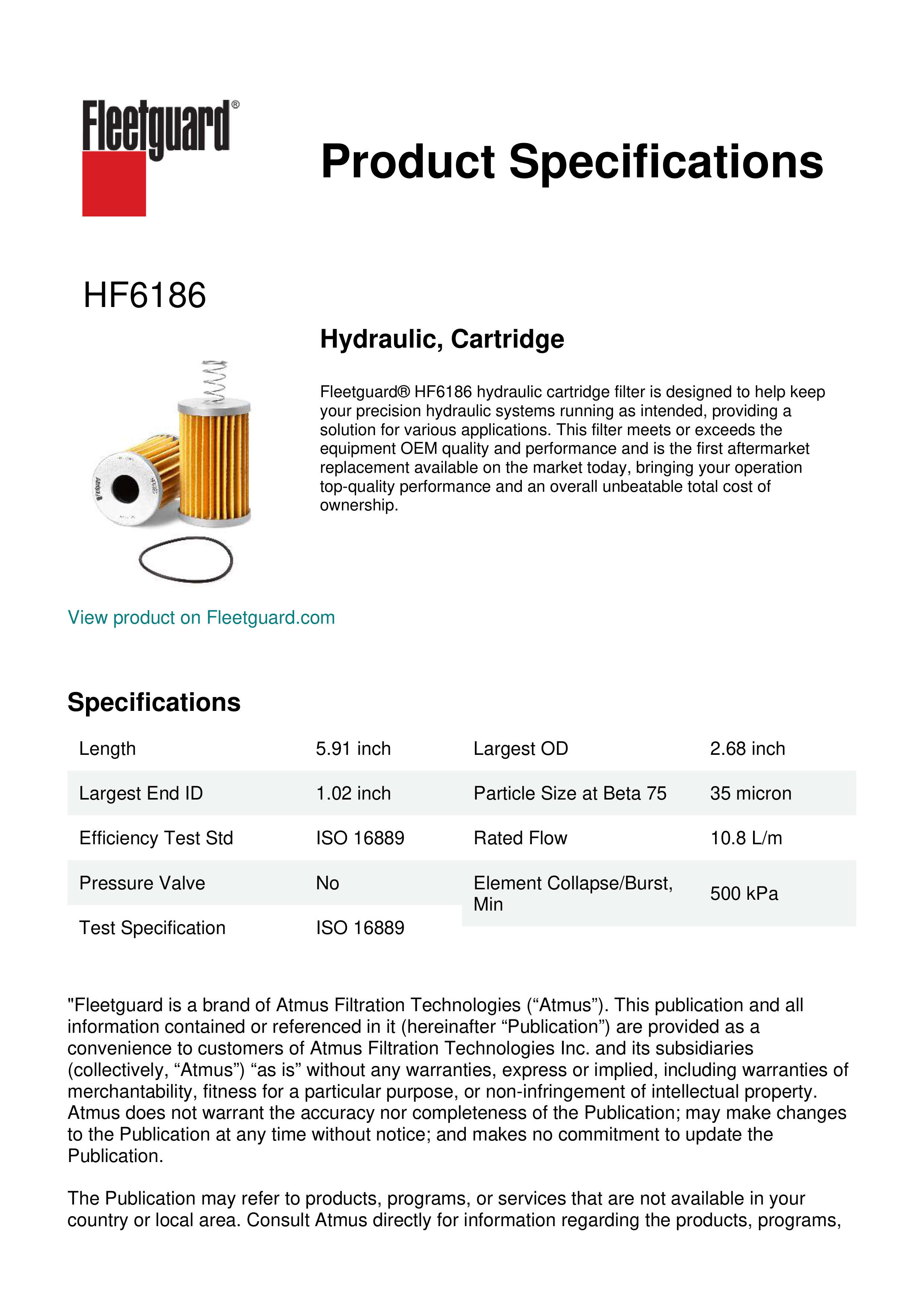 Fleetguard® HF6186 hydraulic cartridge filter is designed to help keep your precision hydraulic systems running as intended, providing a solution for various applications. This filter meets or exceeds the equipment OEM quality and performance and is the first aftermarket replacement available on the market today, bringing your operation top-quality performance and an overall unbeatable total cost of ownership.Specification