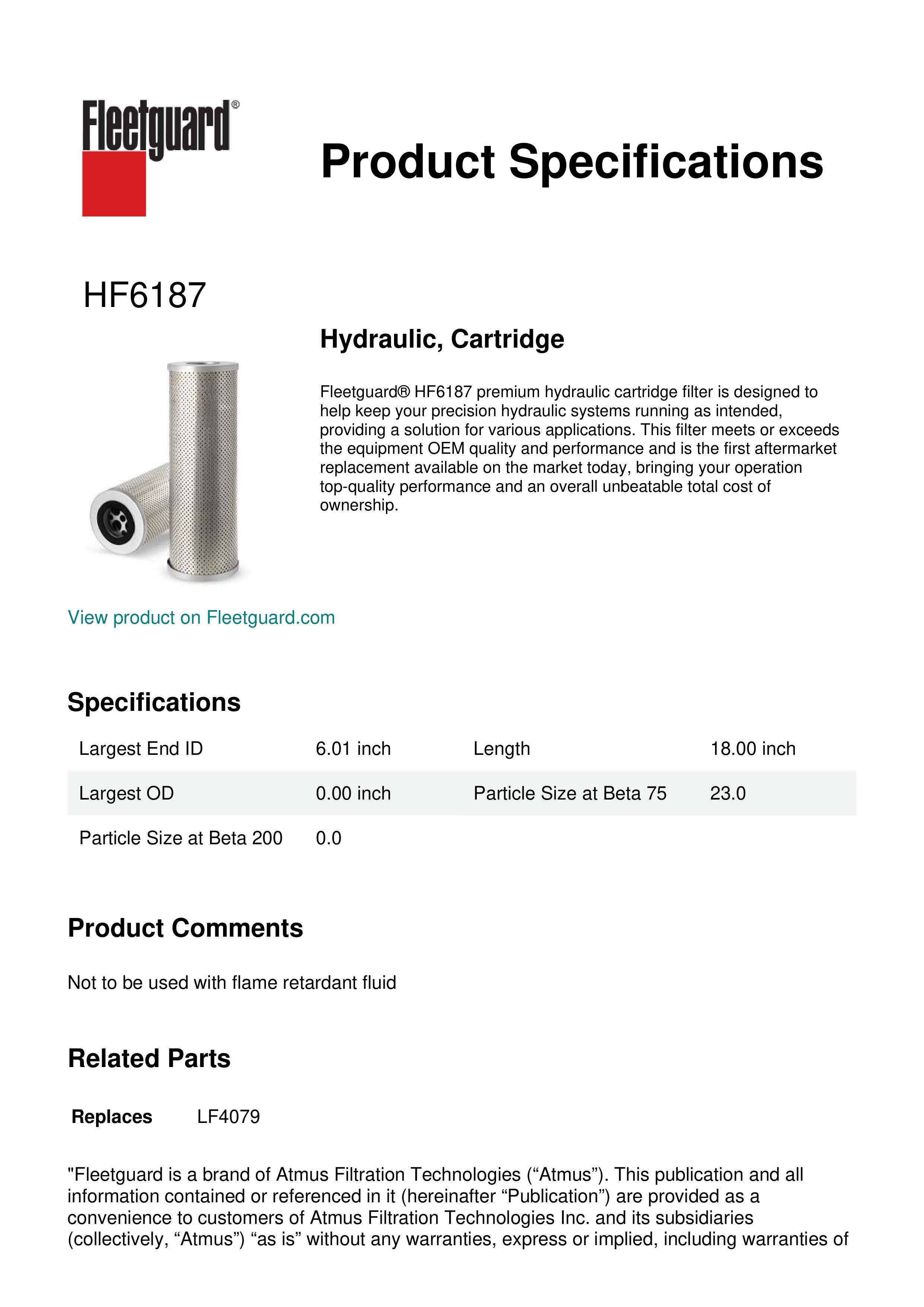 Fleetguard® HF6187 premium hydraulic cartridge filter is designed to help keep your precision hydraulic systems running as intended, providing a solution for various applications. This filter meets or exceeds the equipment OEM quality and performance and is the first aftermarket replacement available on the market today, bringing your operation top-quality performance and an overall unbeatable total cost of ownership.Specification