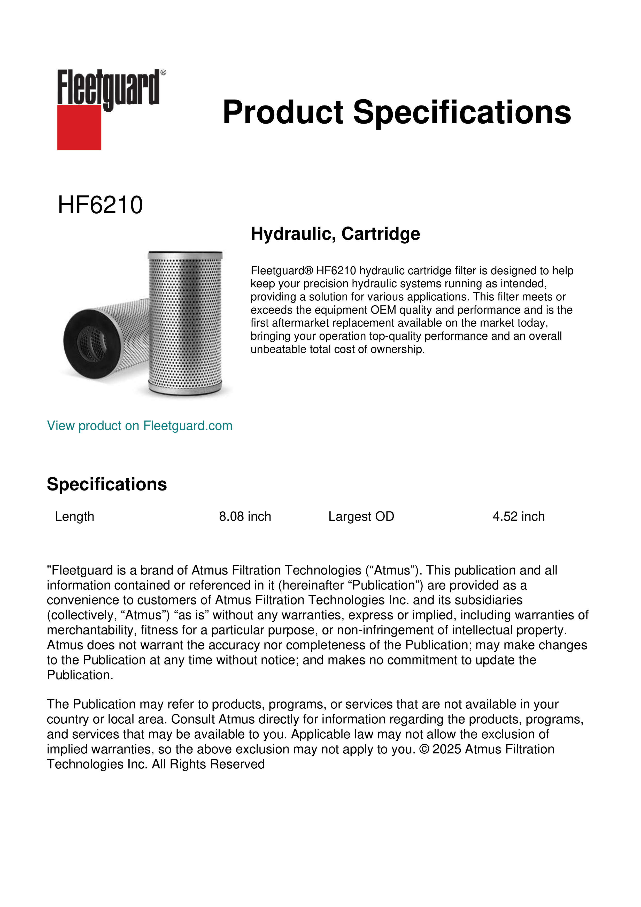 Fleetguard® HF6210 hydraulic cartridge filter is designed to help keep your precision hydraulic systems running as intended, providing a solution for various applications. This filter meets or exceeds the equipment OEM quality and performance and is the first aftermarket replacement available on the market today, bringing your operation top-quality performance and an overall unbeatable total cost of ownership.Specification