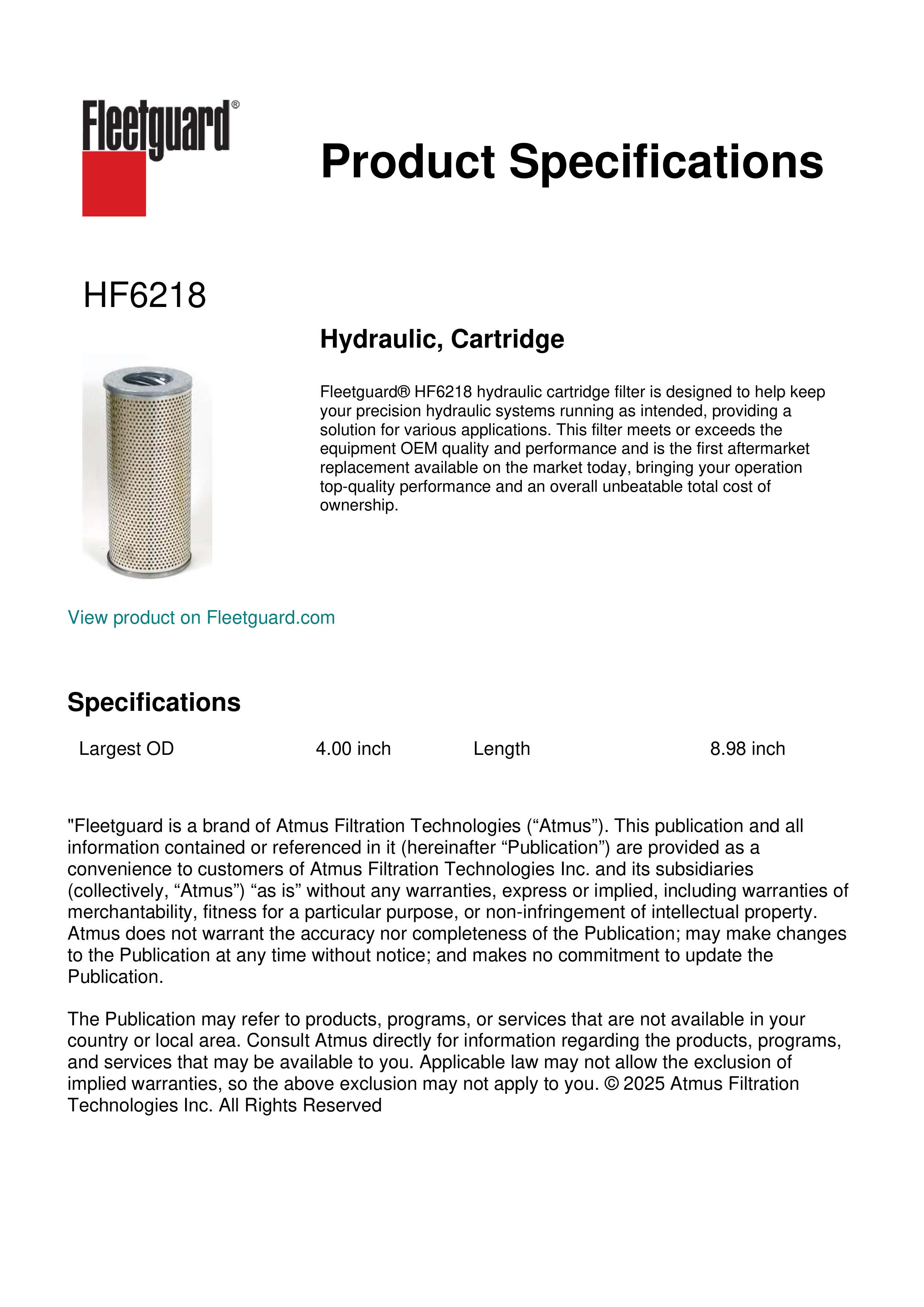 Fleetguard® HF6218 hydraulic cartridge filter is designed to help keep your precision hydraulic systems running as intended, providing a solution for various applications. This filter meets or exceeds the equipment OEM quality and performance and is the first aftermarket replacement available on the market today, bringing your operation top-quality performance and an overall unbeatable total cost of ownership.Specification