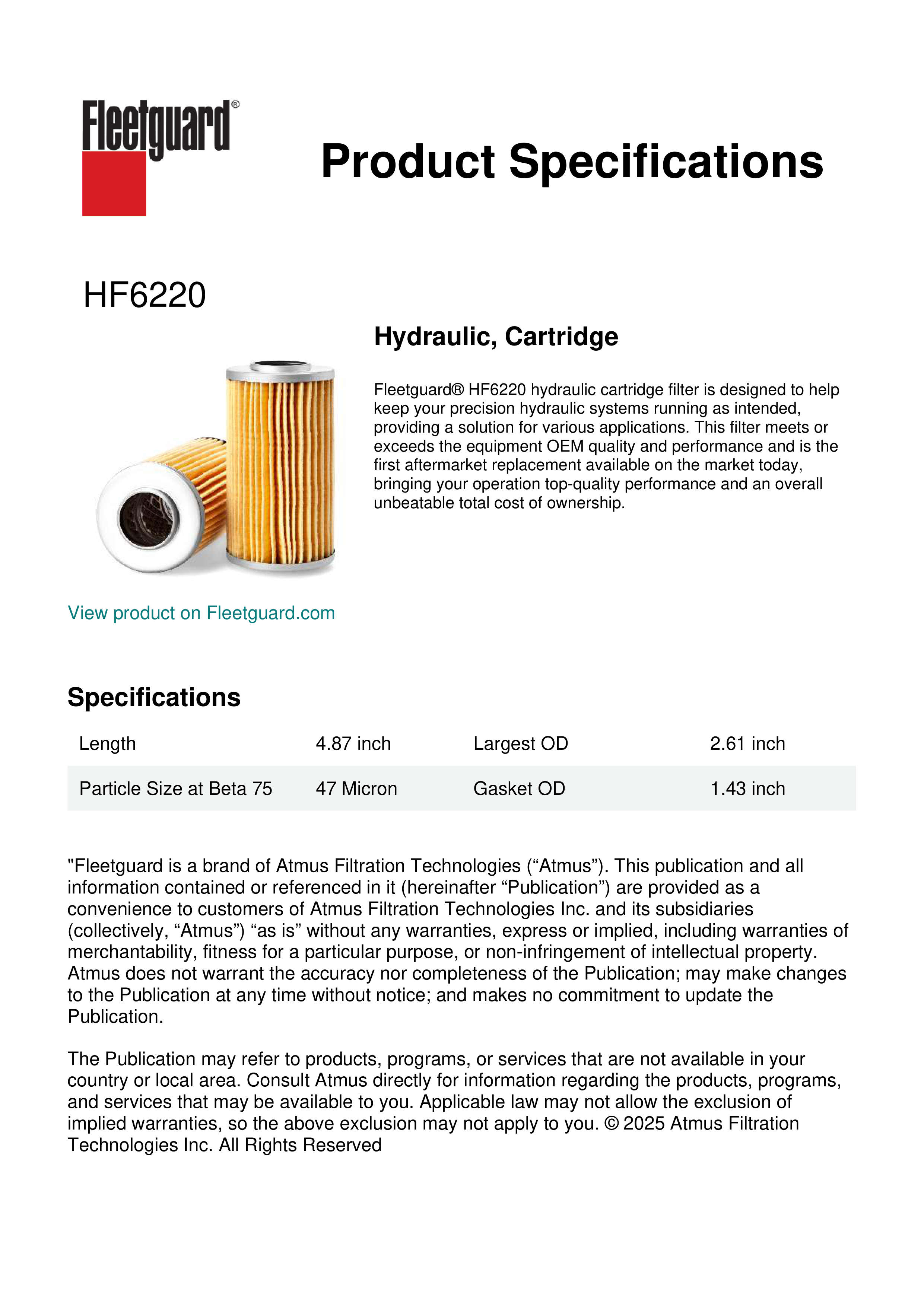 Fleetguard® HF6220 hydraulic cartridge filter is designed to help keep your precision hydraulic systems running as intended, providing a solution for various applications. This filter meets or exceeds the equipment OEM quality and performance and is the first aftermarket replacement available on the market today, bringing your operation top-quality performance and an overall unbeatable total cost of ownership.Specification