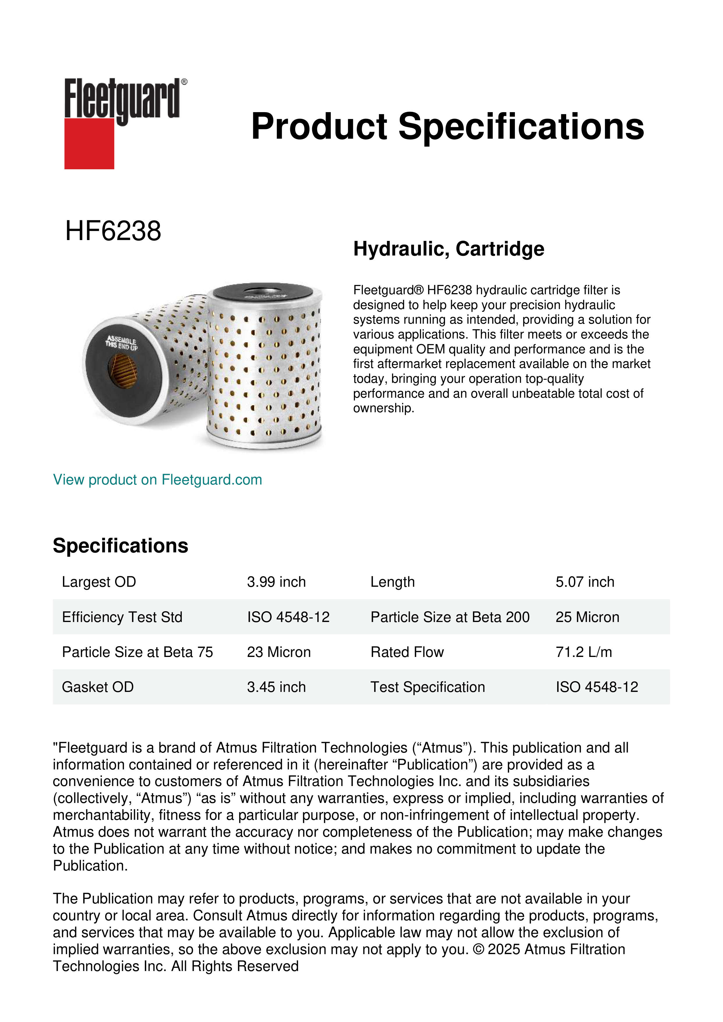 Fleetguard® HF6238 hydraulic cartridge filter is designed to help keep your precision hydraulic systems running as intended, providing a solution for various applications. This filter meets or exceeds the equipment OEM quality and performance and is the first aftermarket replacement available on the market today, bringing your operation top-quality performance and an overall unbeatable total cost of ownership.Specification
