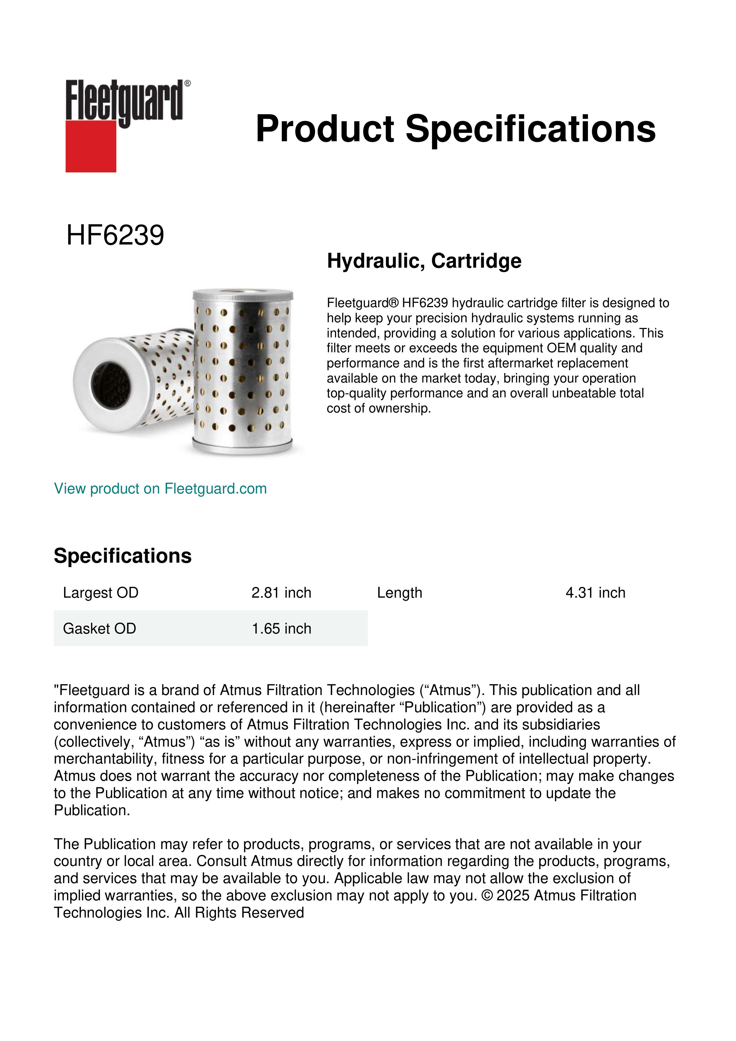 Fleetguard® HF6239 hydraulic cartridge filter is designed to help keep your precision hydraulic systems running as intended, providing a solution for various applications. This filter meets or exceeds the equipment OEM quality and performance and is the first aftermarket replacement available on the market today, bringing your operation top-quality performance and an overall unbeatable total cost of ownership.Specification