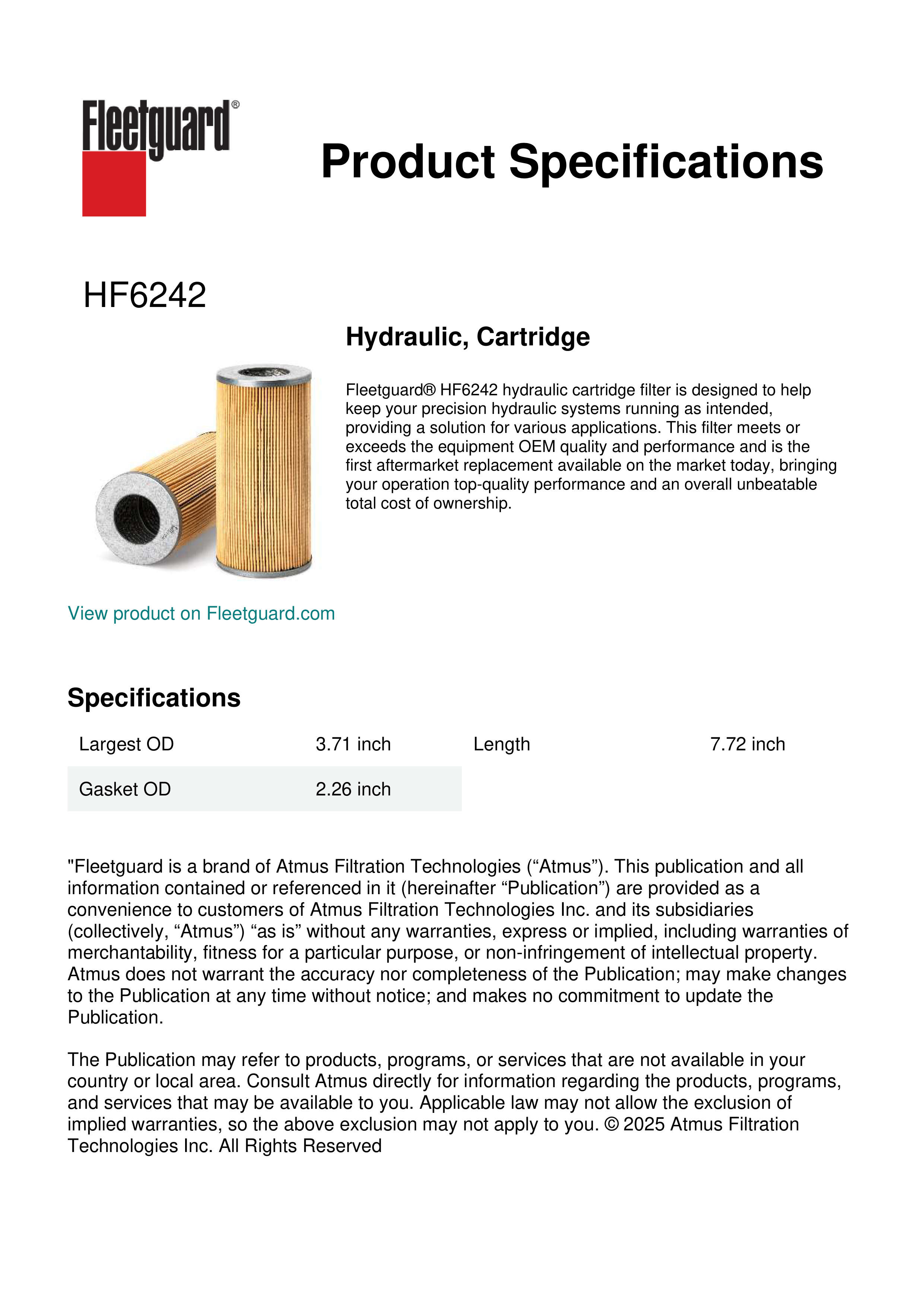 Fleetguard® HF6242 hydraulic cartridge filter is designed to help keep your precision hydraulic systems running as intended, providing a solution for various applications. This filter meets or exceeds the equipment OEM quality and performance and is the first aftermarket replacement available on the market today, bringing your operation top-quality performance and an overall unbeatable total cost of ownership.Specification