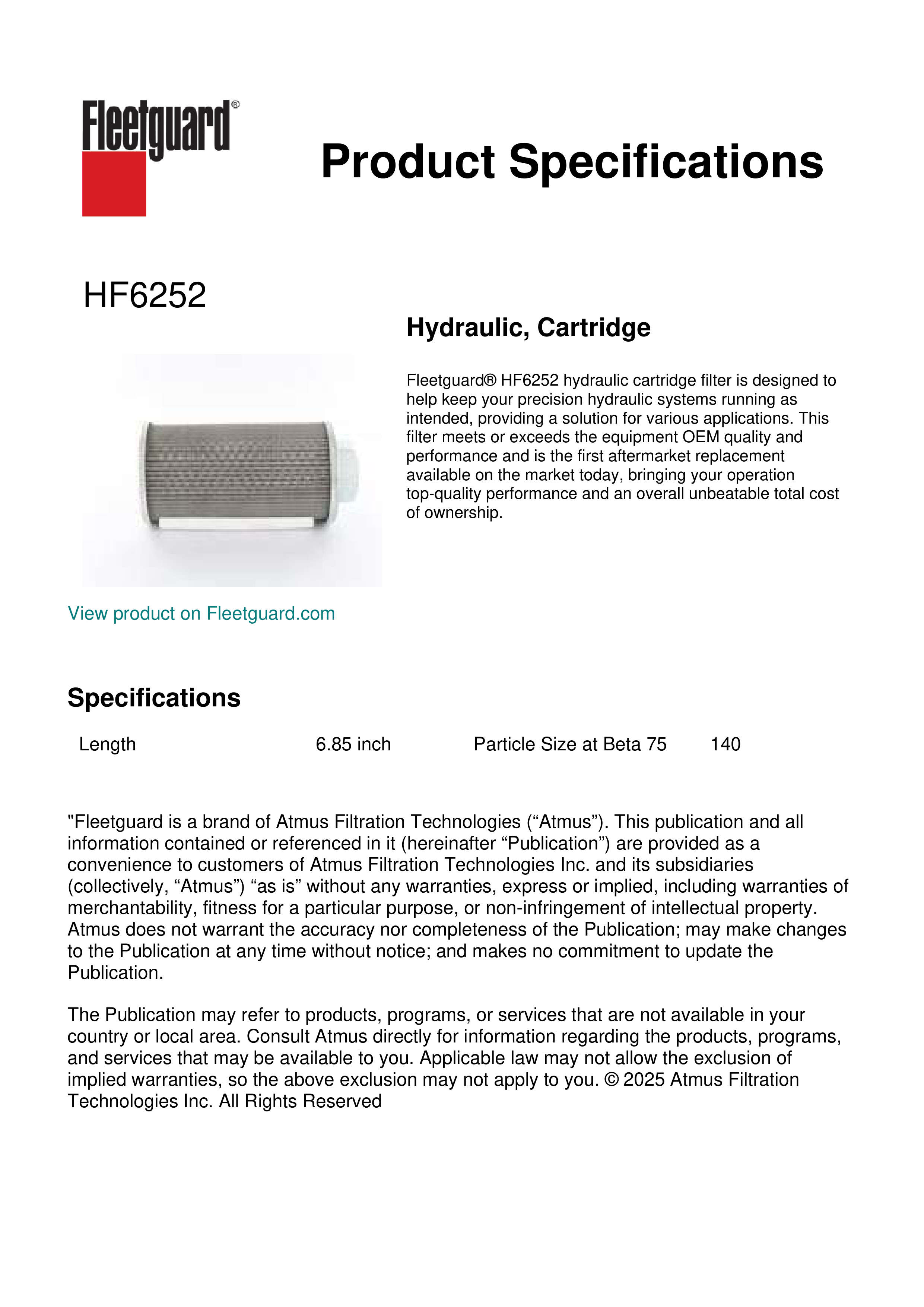 Fleetguard® HF6252 hydraulic cartridge filter is designed to help keep your precision hydraulic systems running as intended, providing a solution for various applications. This filter meets or exceeds the equipment OEM quality and performance and is the first aftermarket replacement available on the market today, bringing your operation top-quality performance and an overall unbeatable total cost of ownership.Specification