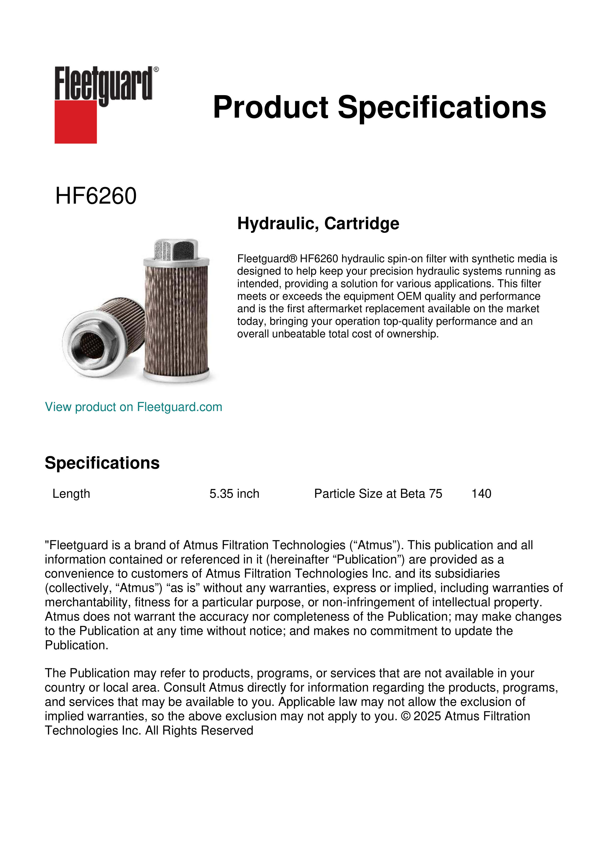 Fleetguard® HF6260 hydraulic spin-on filter with synthetic media is designed to help keep your precision hydraulic systems running as intended, providing a solution for various applications. This filter meets or exceeds the equipment OEM quality and performance and is the first aftermarket replacement available on the market today, bringing your operation top-quality performance and an overall unbeatable total cost of ownership.Specification
