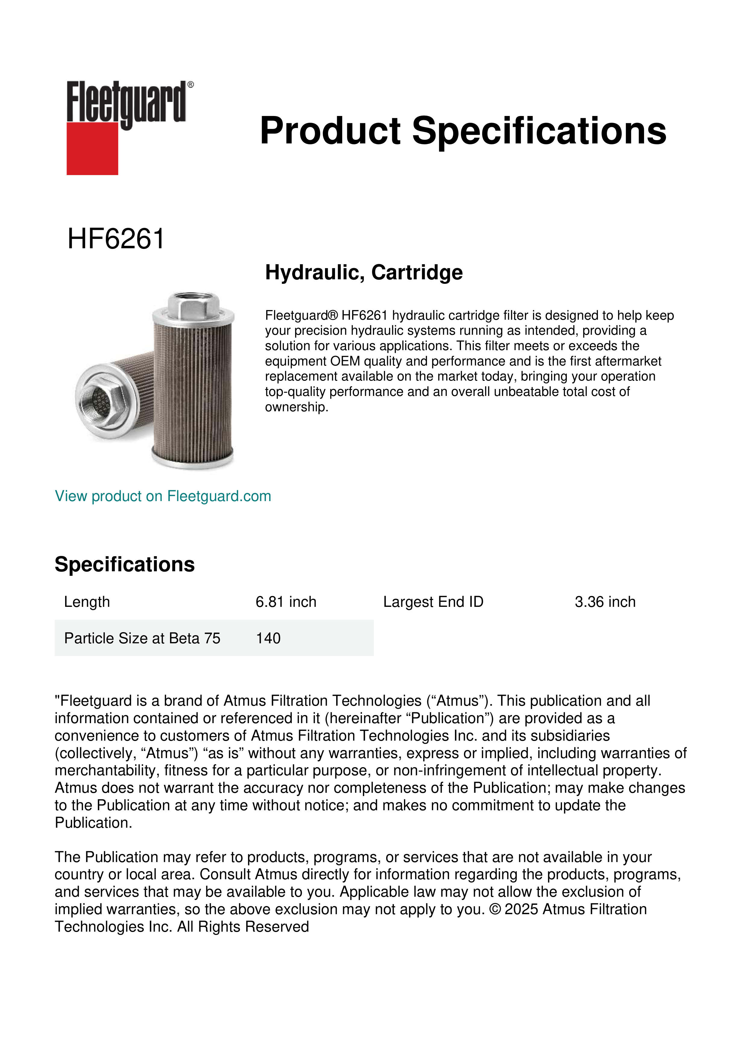Fleetguard® HF6261 hydraulic cartridge filter is designed to help keep your precision hydraulic systems running as intended, providing a solution for various applications. This filter meets or exceeds the equipment OEM quality and performance and is the first aftermarket replacement available on the market today, bringing your operation top-quality performance and an overall unbeatable total cost of ownership.Specification
