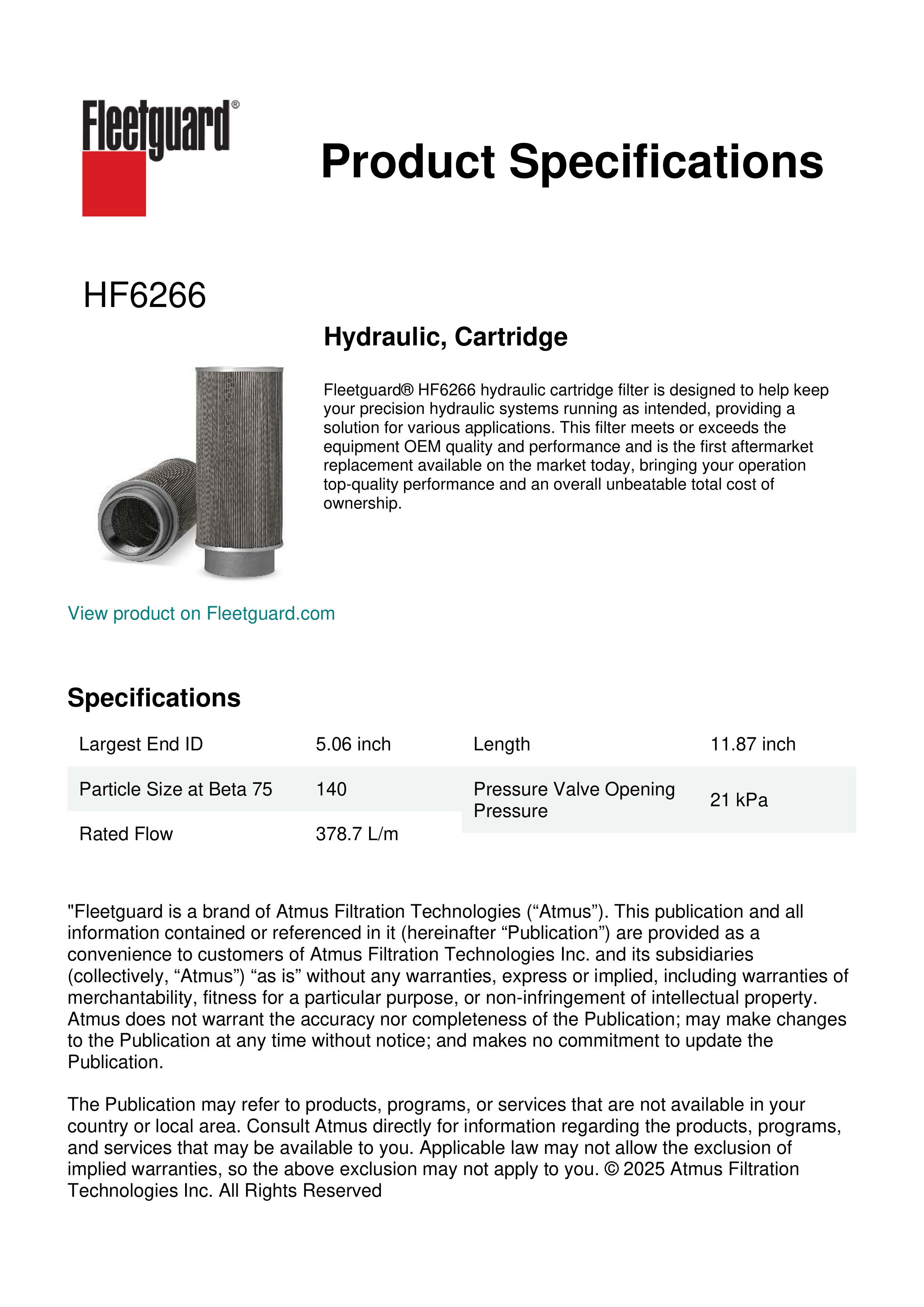 Fleetguard® HF6266 hydraulic cartridge filter is designed to help keep your precision hydraulic systems running as intended, providing a solution for various applications. This filter meets or exceeds the equipment OEM quality and performance and is the first aftermarket replacement available on the market today, bringing your operation top-quality performance and an overall unbeatable total cost of ownership.Specification