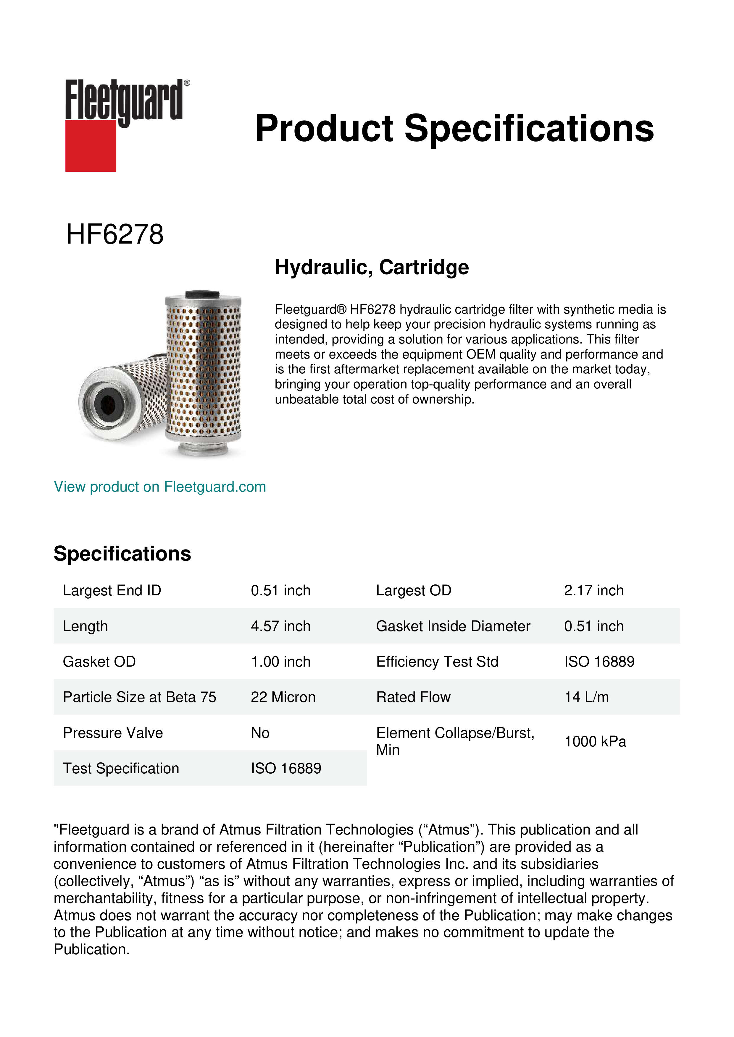 Fleetguard® HF6278 hydraulic cartridge filter with synthetic media is designed to help keep your precision hydraulic systems running as intended, providing a solution for various applications. This filter meets or exceeds the equipment OEM quality and performance and is the first aftermarket replacement available on the market today, bringing your operation top-quality performance and an overall unbeatable total cost of ownership.Specification