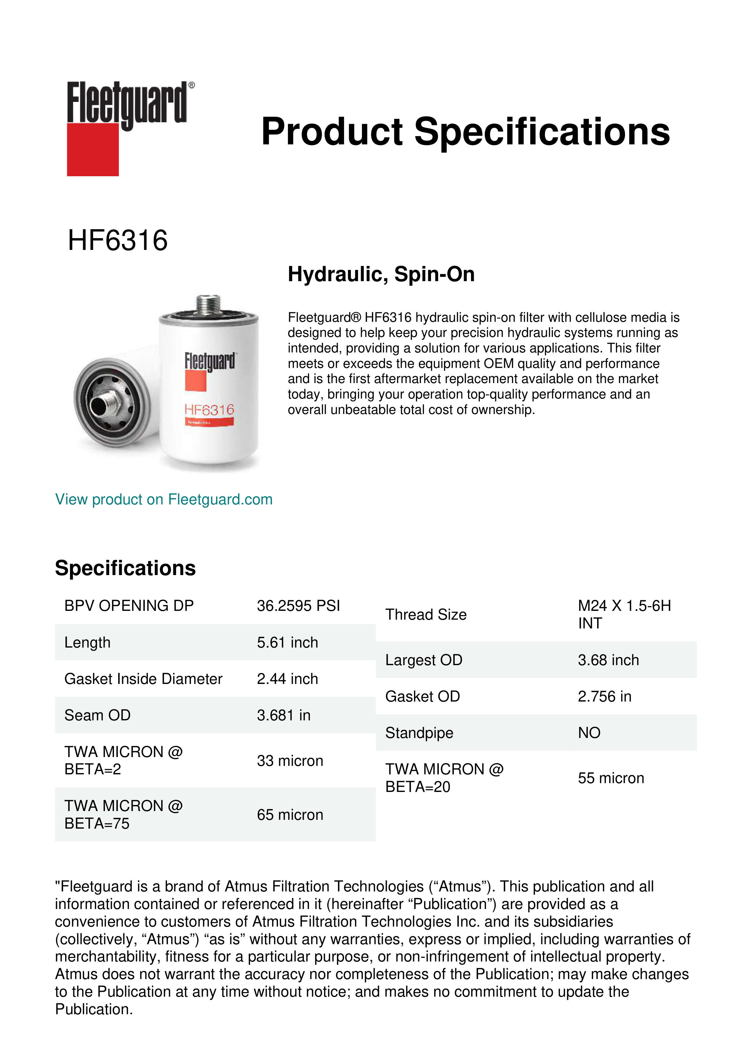 Fleetguard® HF6316 hydraulic spin-on filter with cellulose media is designed to help keep your precision hydraulic systems running as intended, providing a solution for various applications. This filter meets or exceeds the equipment OEM quality and performance and is the first aftermarket replacement available on the market today, bringing your operation top-quality performance and an overall unbeatable total cost of ownership.Specification