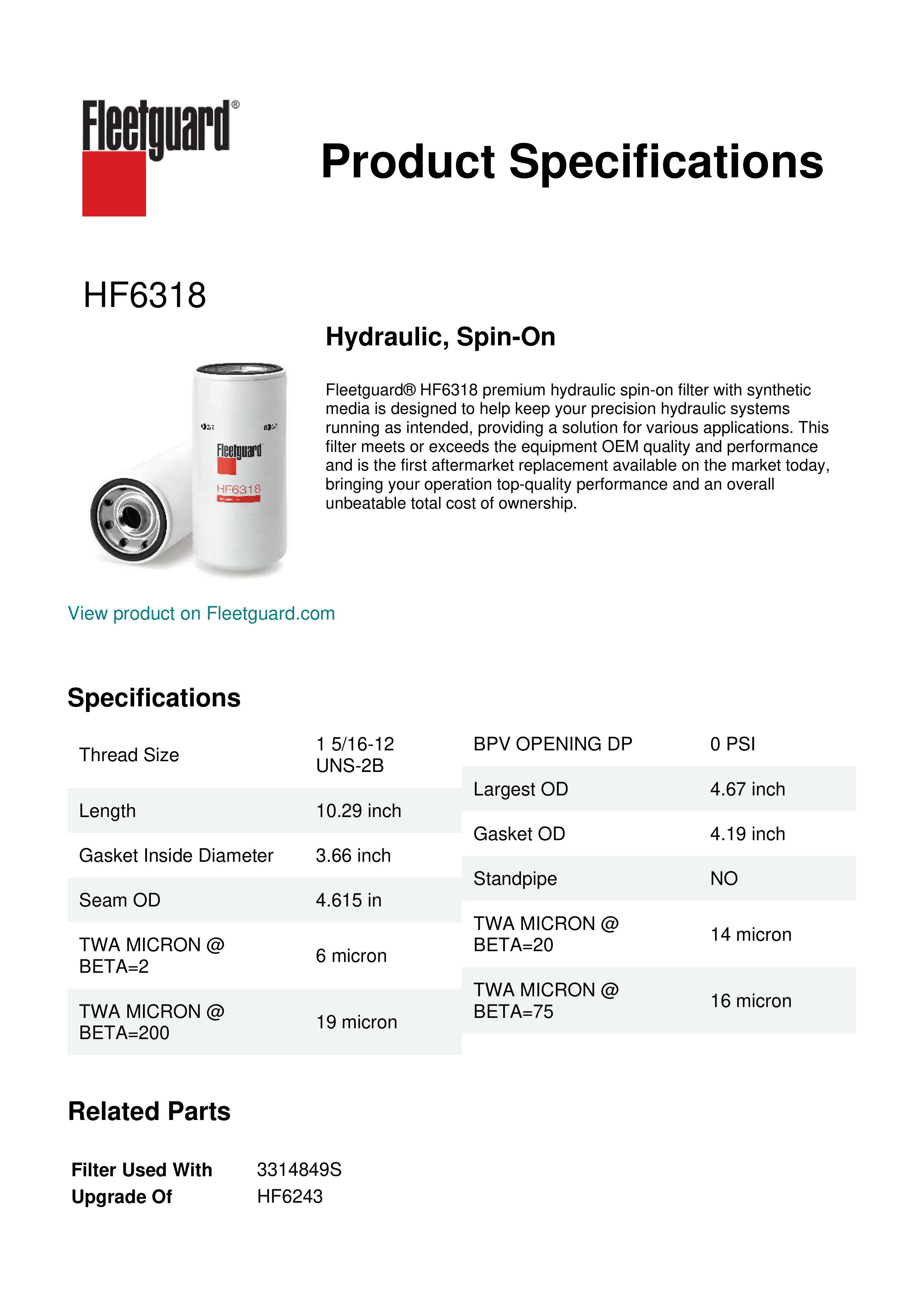 Fleetguard® HF6318 premium hydraulic spin-on filter with synthetic media is designed to help keep your precision hydraulic systems running as intended, providing a solution for various applications. This filter meets or exceeds the equipment OEM quality and performance and is the first aftermarket replacement available on the market today, bringing your operation top-quality performance and an overall unbeatable total cost of ownership.Specification