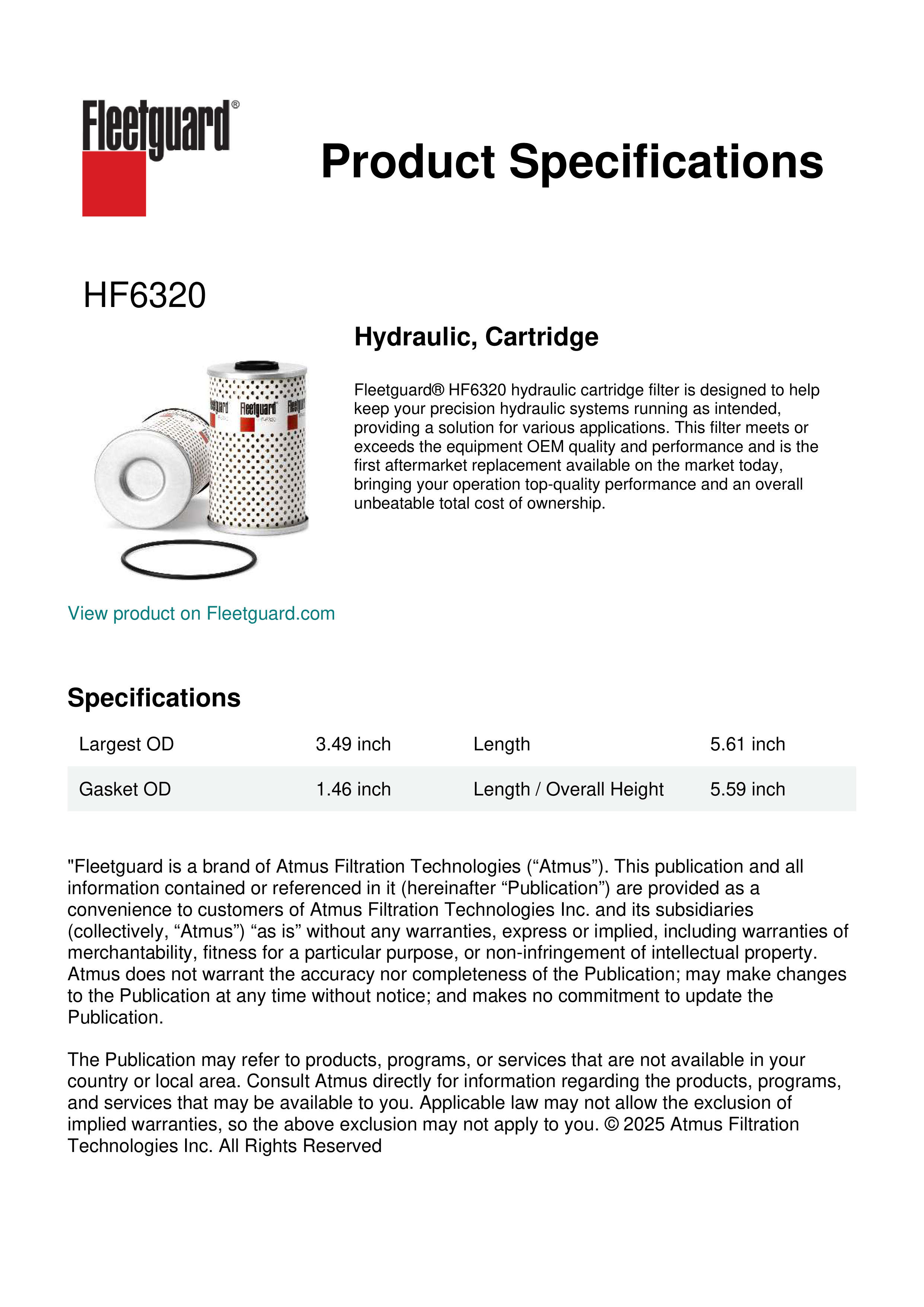 Fleetguard® HF6320 hydraulic cartridge filter is designed to help keep your precision hydraulic systems running as intended, providing a solution for various applications. This filter meets or exceeds the equipment OEM quality and performance and is the first aftermarket replacement available on the market today, bringing your operation top-quality performance and an overall unbeatable total cost of ownership.Specification
