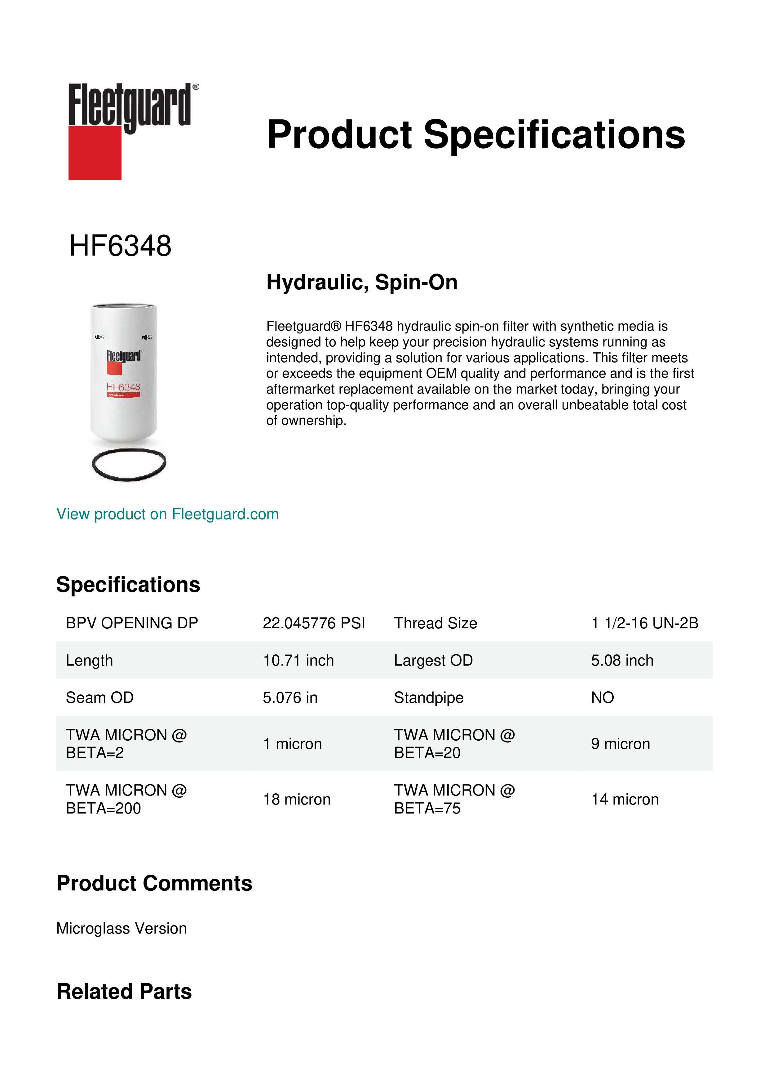 Fleetguard® HF6348 hydraulic spin-on filter with synthetic media is designed to help keep your precision hydraulic systems running as intended, providing a solution for various applications. This filter meets or exceeds the equipment OEM quality and performance and is the first aftermarket replacement available on the market today, bringing your operation top-quality performance and an overall unbeatable total cost of ownership.Specification