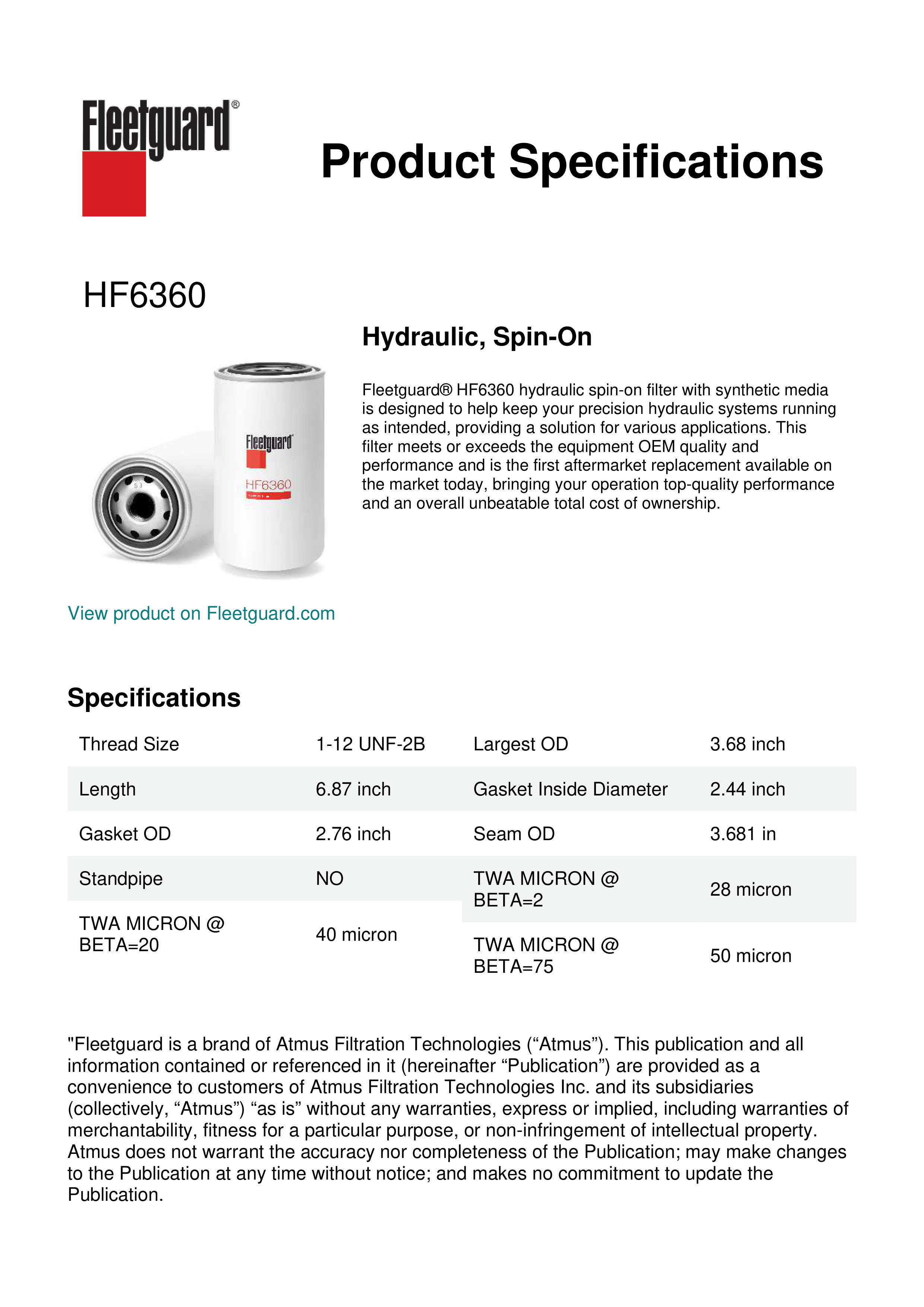 Fleetguard® HF6360 hydraulic spin-on filter with synthetic media is designed to help keep your precision hydraulic systems running as intended, providing a solution for various applications. This filter meets or exceeds the equipment OEM quality and performance and is the first aftermarket replacement available on the market today, bringing your operation top-quality performance and an overall unbeatable total cost of ownership.Specification