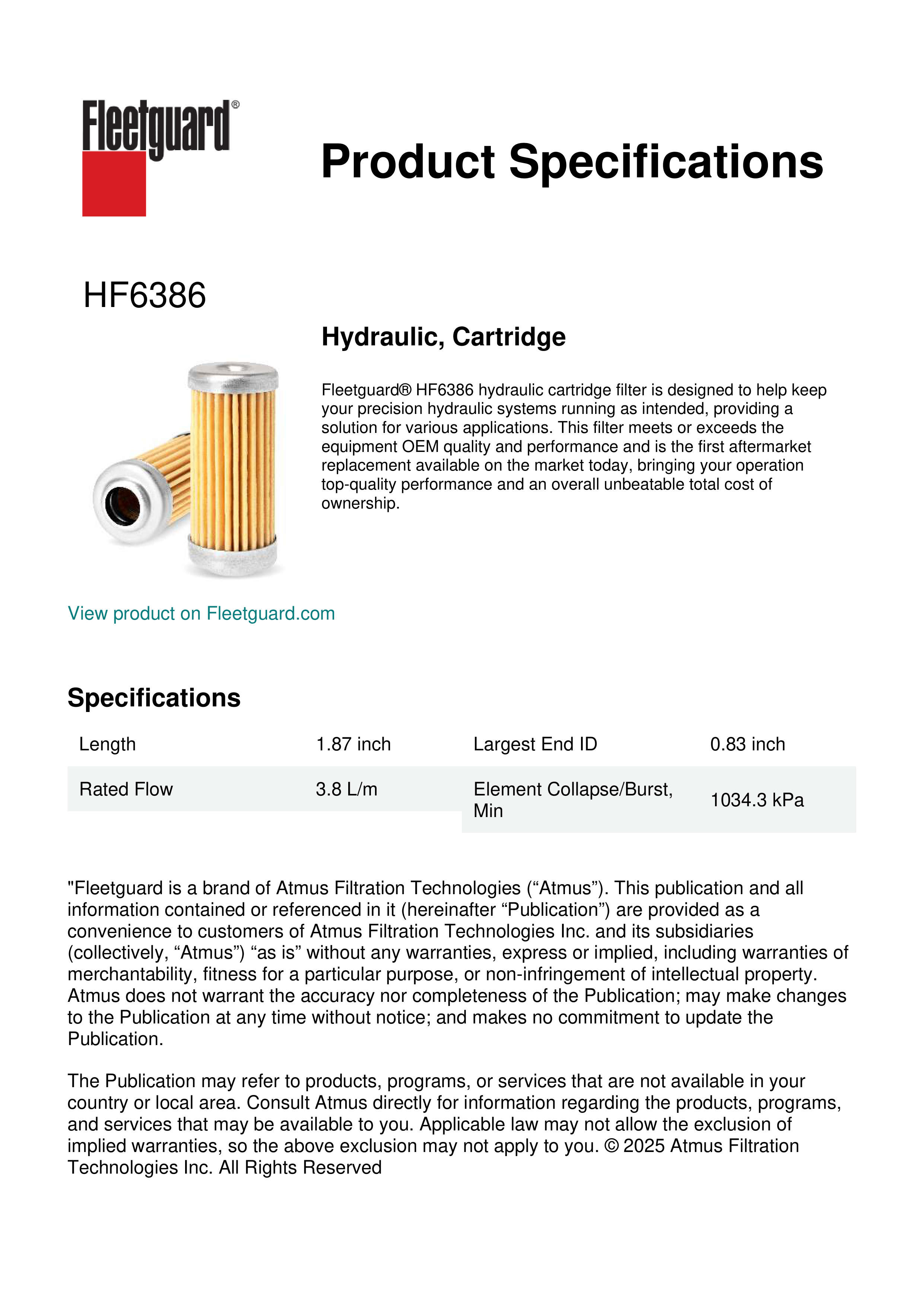 Fleetguard® HF6386 hydraulic cartridge filter is designed to help keep your precision hydraulic systems running as intended, providing a solution for various applications. This filter meets or exceeds the equipment OEM quality and performance and is the first aftermarket replacement available on the market today, bringing your operation top-quality performance and an overall unbeatable total cost of ownership.Specification