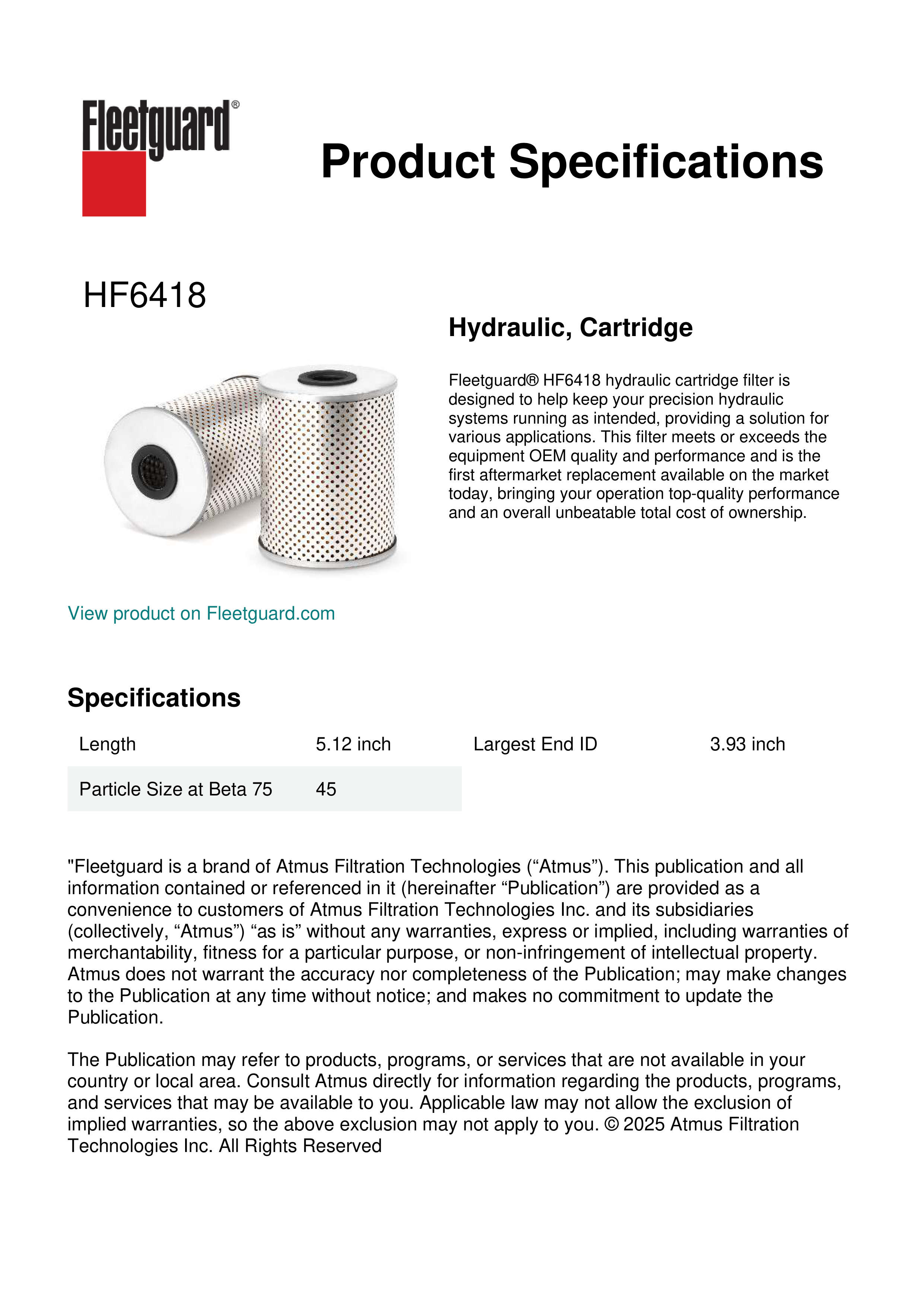 Fleetguard® HF6418 hydraulic cartridge filter is designed to help keep your precision hydraulic systems running as intended, providing a solution for various applications. This filter meets or exceeds the equipment OEM quality and performance and is the first aftermarket replacement available on the market today, bringing your operation top-quality performance and an overall unbeatable total cost of ownership.Specification