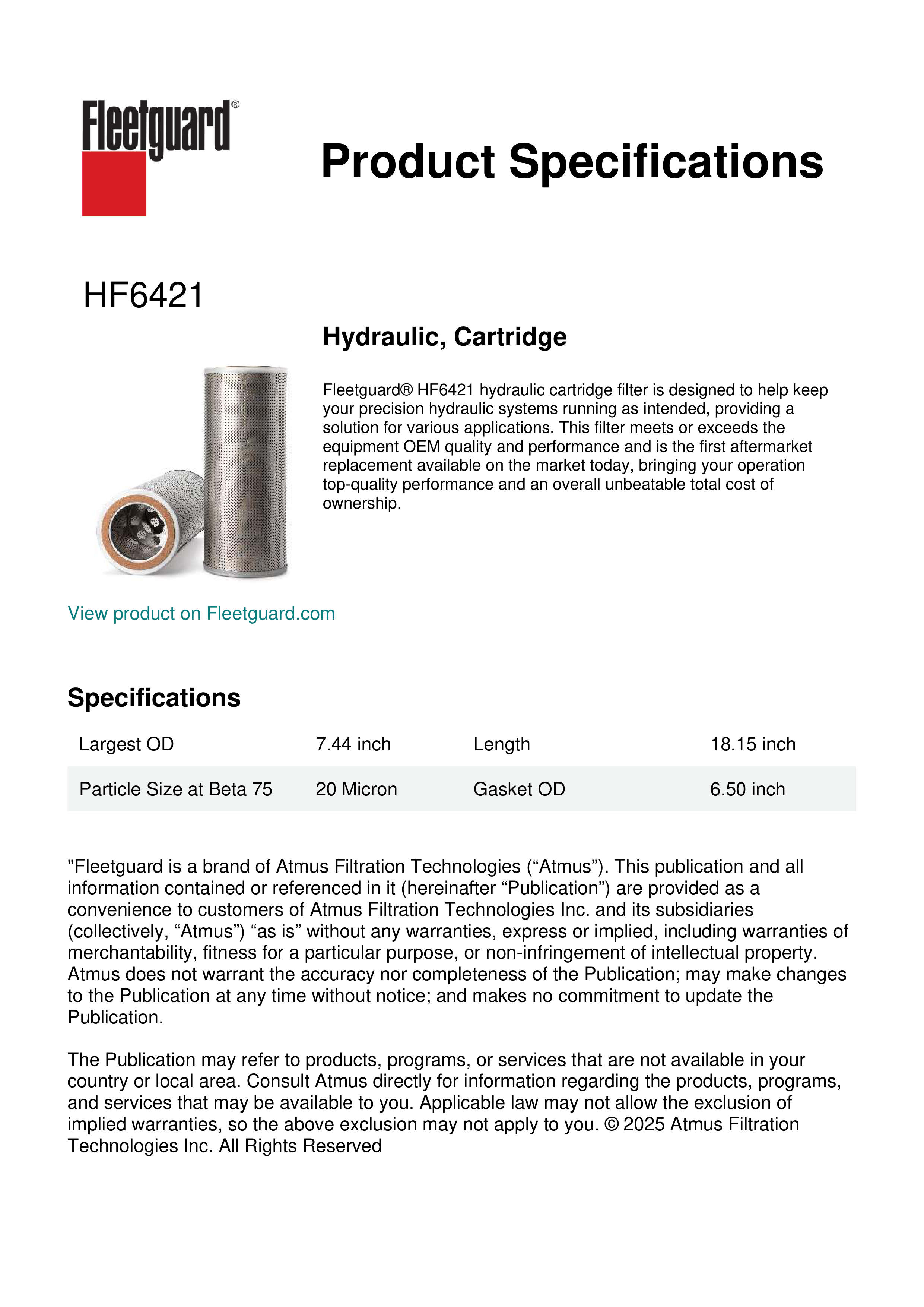 Fleetguard® HF6421 hydraulic cartridge filter is designed to help keep your precision hydraulic systems running as intended, providing a solution for various applications. This filter meets or exceeds the equipment OEM quality and performance and is the first aftermarket replacement available on the market today, bringing your operation top-quality performance and an overall unbeatable total cost of ownership.Specification