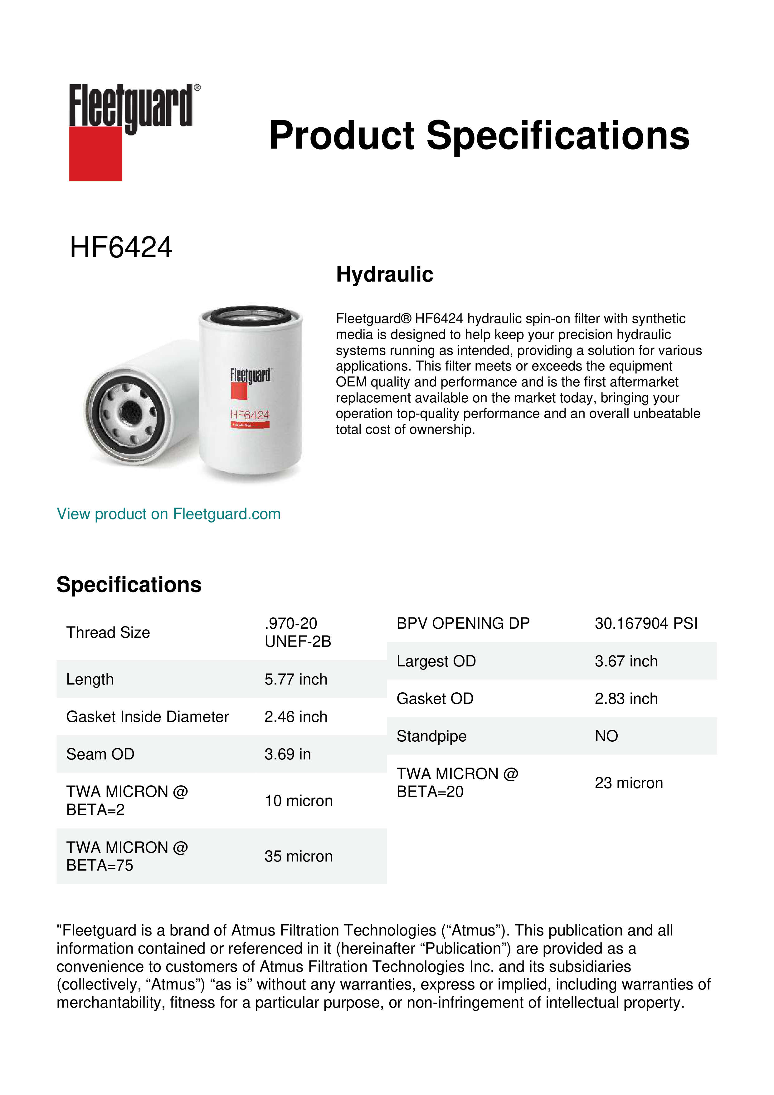 Fleetguard® HF6424 hydraulic spin-on filter with synthetic media is designed to help keep your precision hydraulic systems running as intended, providing a solution for various applications. This filter meets or exceeds the equipment OEM quality and performance and is the first aftermarket replacement available on the market today, bringing your operation top-quality performance and an overall unbeatable total cost of ownership.Specification