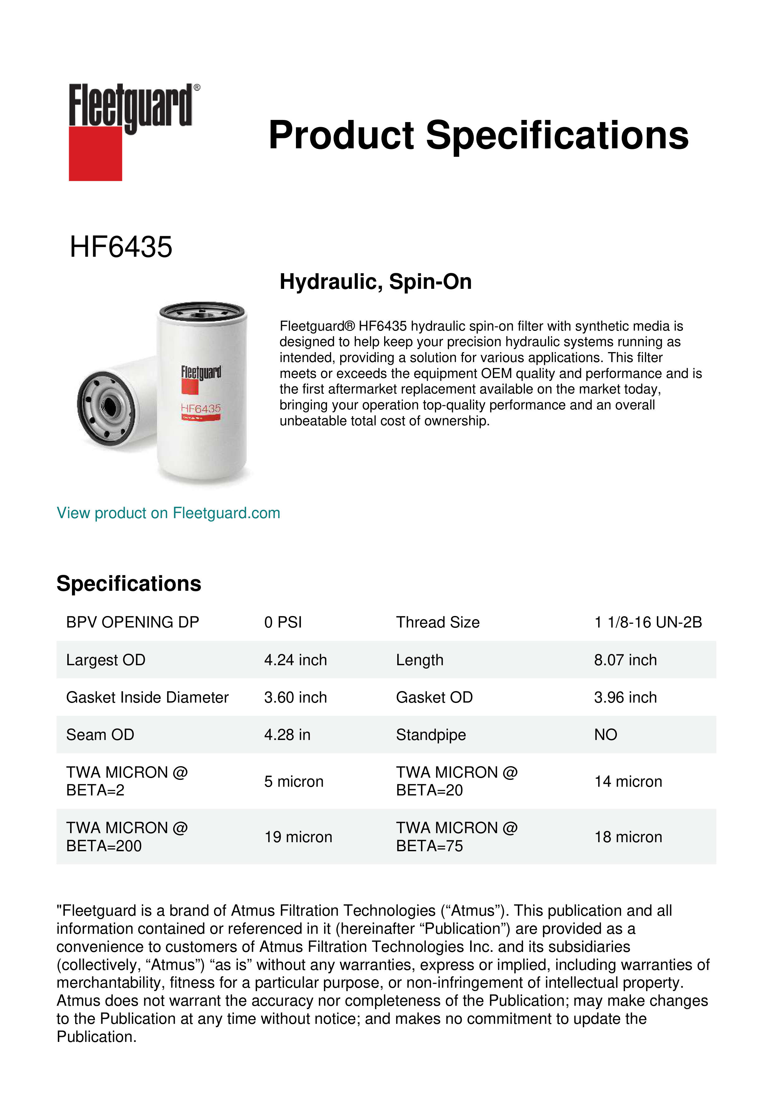 Fleetguard® HF6435 hydraulic spin-on filter with synthetic media is designed to help keep your precision hydraulic systems running as intended, providing a solution for various applications. This filter meets or exceeds the equipment OEM quality and performance and is the first aftermarket replacement available on the market today, bringing your operation top-quality performance and an overall unbeatable total cost of ownership.Specification