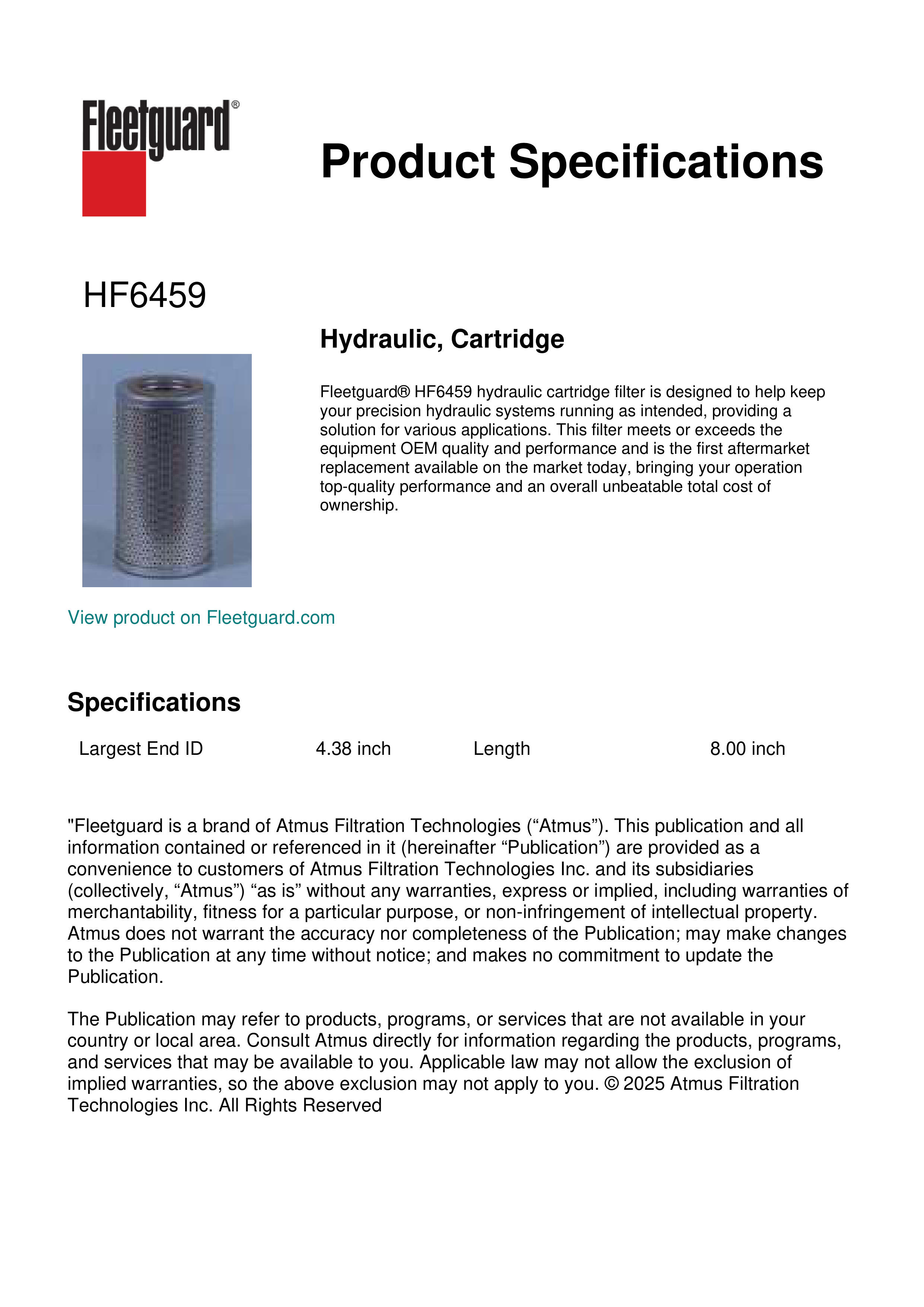 Fleetguard® HF6459 hydraulic cartridge filter is designed to help keep your precision hydraulic systems running as intended, providing a solution for various applications. This filter meets or exceeds the equipment OEM quality and performance and is the first aftermarket replacement available on the market today, bringing your operation top-quality performance and an overall unbeatable total cost of ownership.Specification