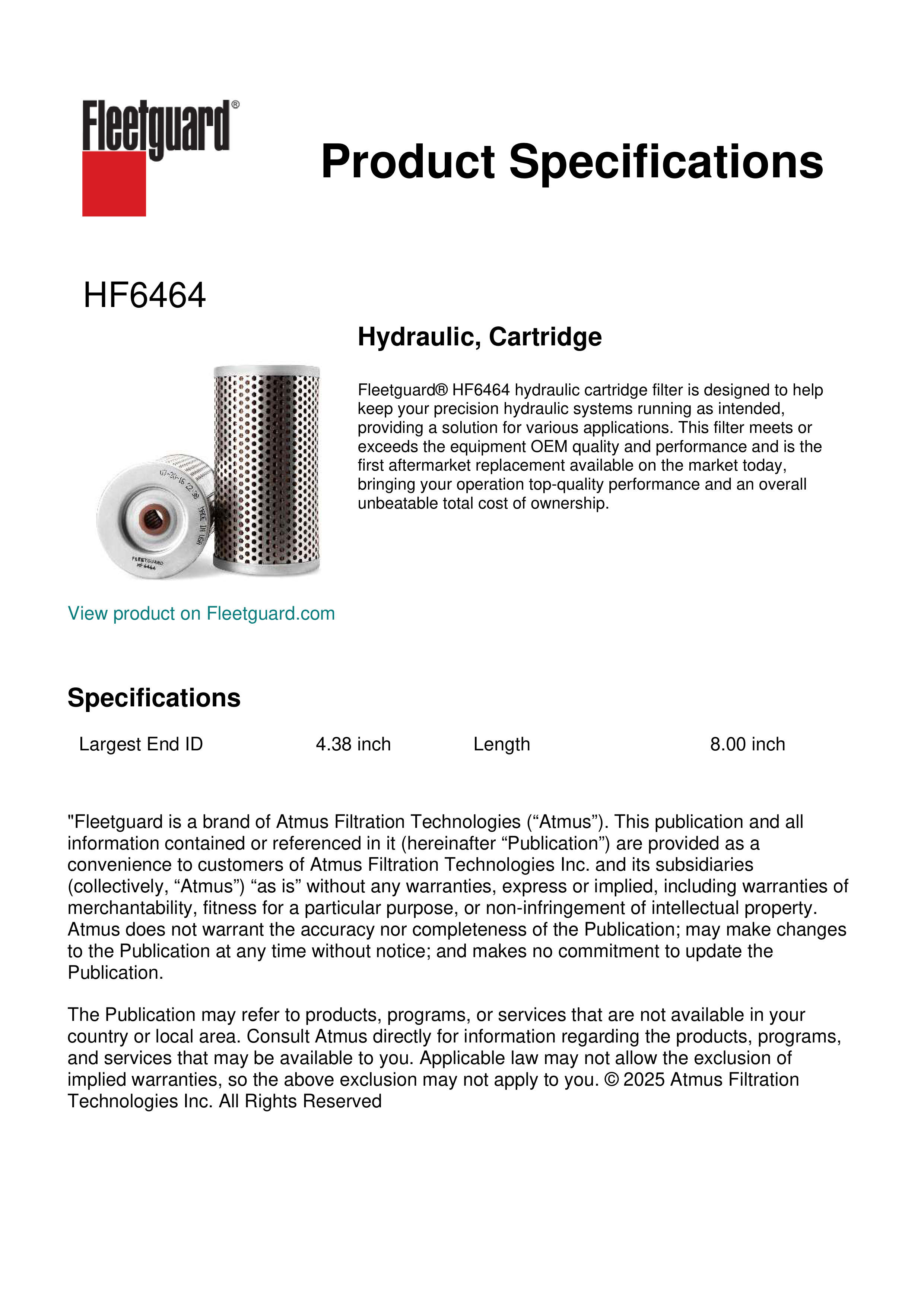 Fleetguard® HF6464 hydraulic cartridge filter is designed to help keep your precision hydraulic systems running as intended, providing a solution for various applications. This filter meets or exceeds the equipment OEM quality and performance and is the first aftermarket replacement available on the market today, bringing your operation top-quality performance and an overall unbeatable total cost of ownership.Specification