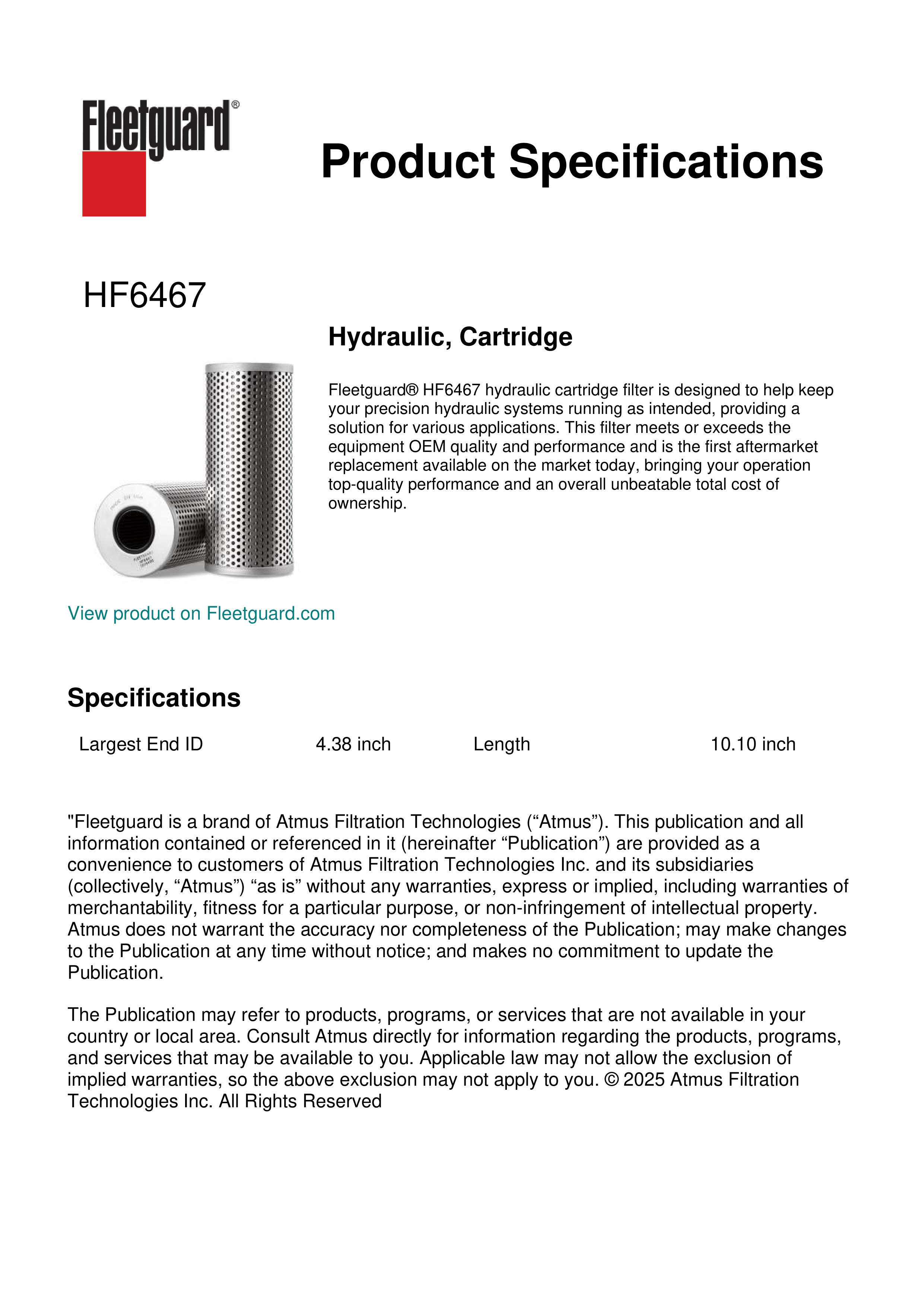 Fleetguard® HF6467 hydraulic cartridge filter is designed to help keep your precision hydraulic systems running as intended, providing a solution for various applications. This filter meets or exceeds the equipment OEM quality and performance and is the first aftermarket replacement available on the market today, bringing your operation top-quality performance and an overall unbeatable total cost of ownership.Specification