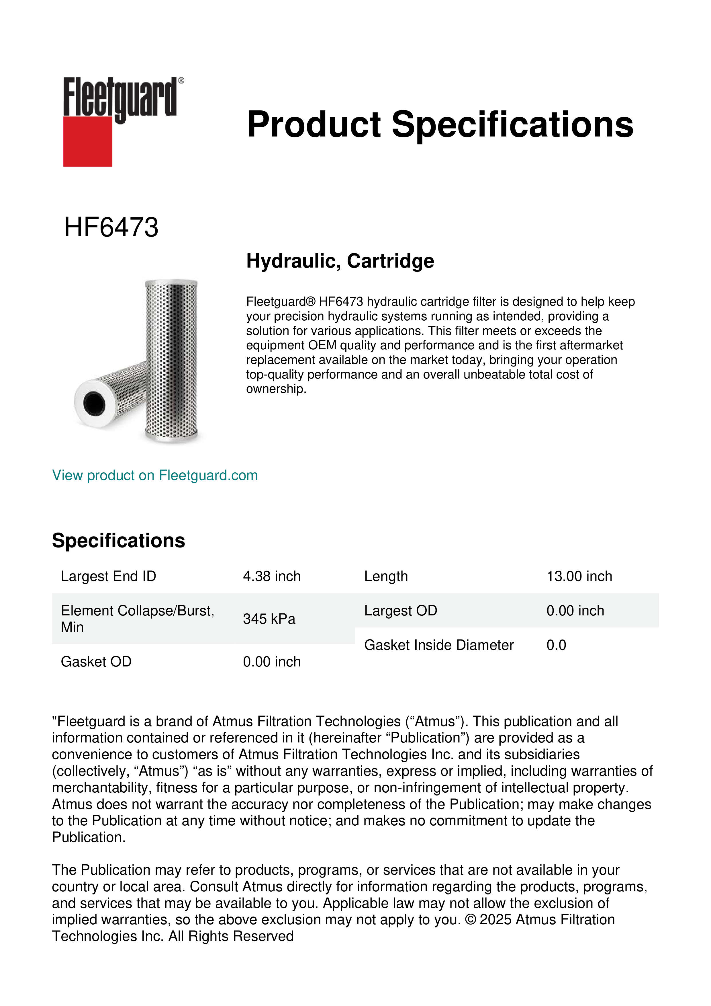 Fleetguard® HF6473 hydraulic cartridge filter is designed to help keep your precision hydraulic systems running as intended, providing a solution for various applications. This filter meets or exceeds the equipment OEM quality and performance and is the first aftermarket replacement available on the market today, bringing your operation top-quality performance and an overall unbeatable total cost of ownership.Specification