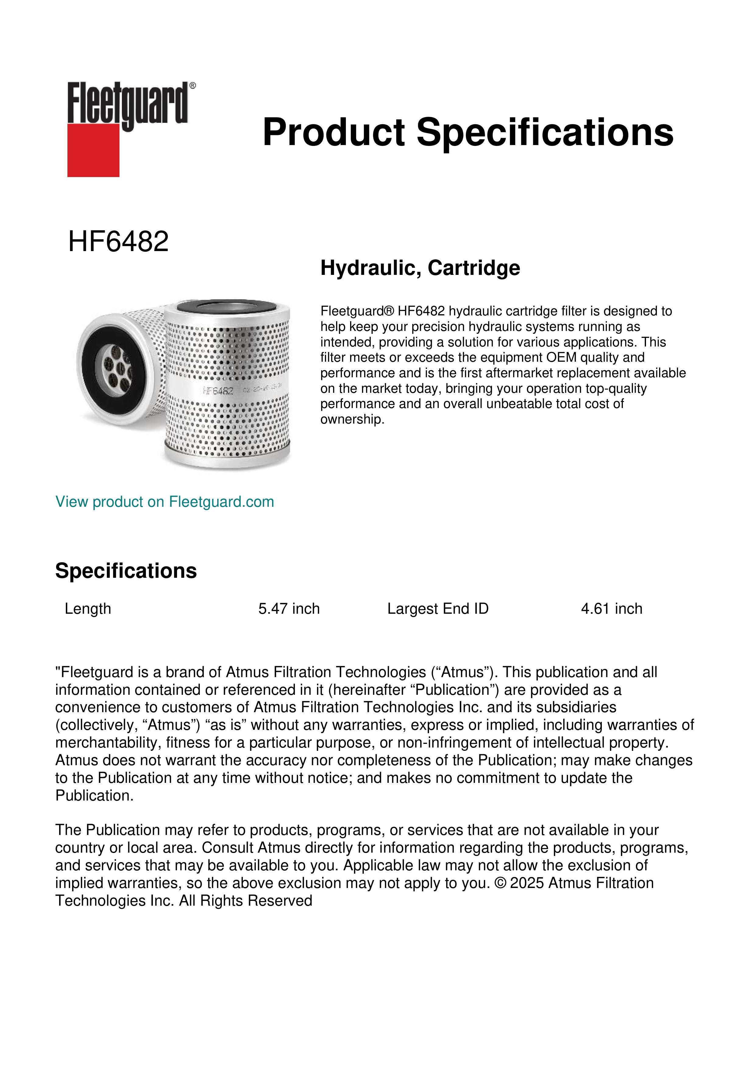 Fleetguard® HF6482 hydraulic cartridge filter is designed to help keep your precision hydraulic systems running as intended, providing a solution for various applications. This filter meets or exceeds the equipment OEM quality and performance and is the first aftermarket replacement available on the market today, bringing your operation top-quality performance and an overall unbeatable total cost of ownership.Specification